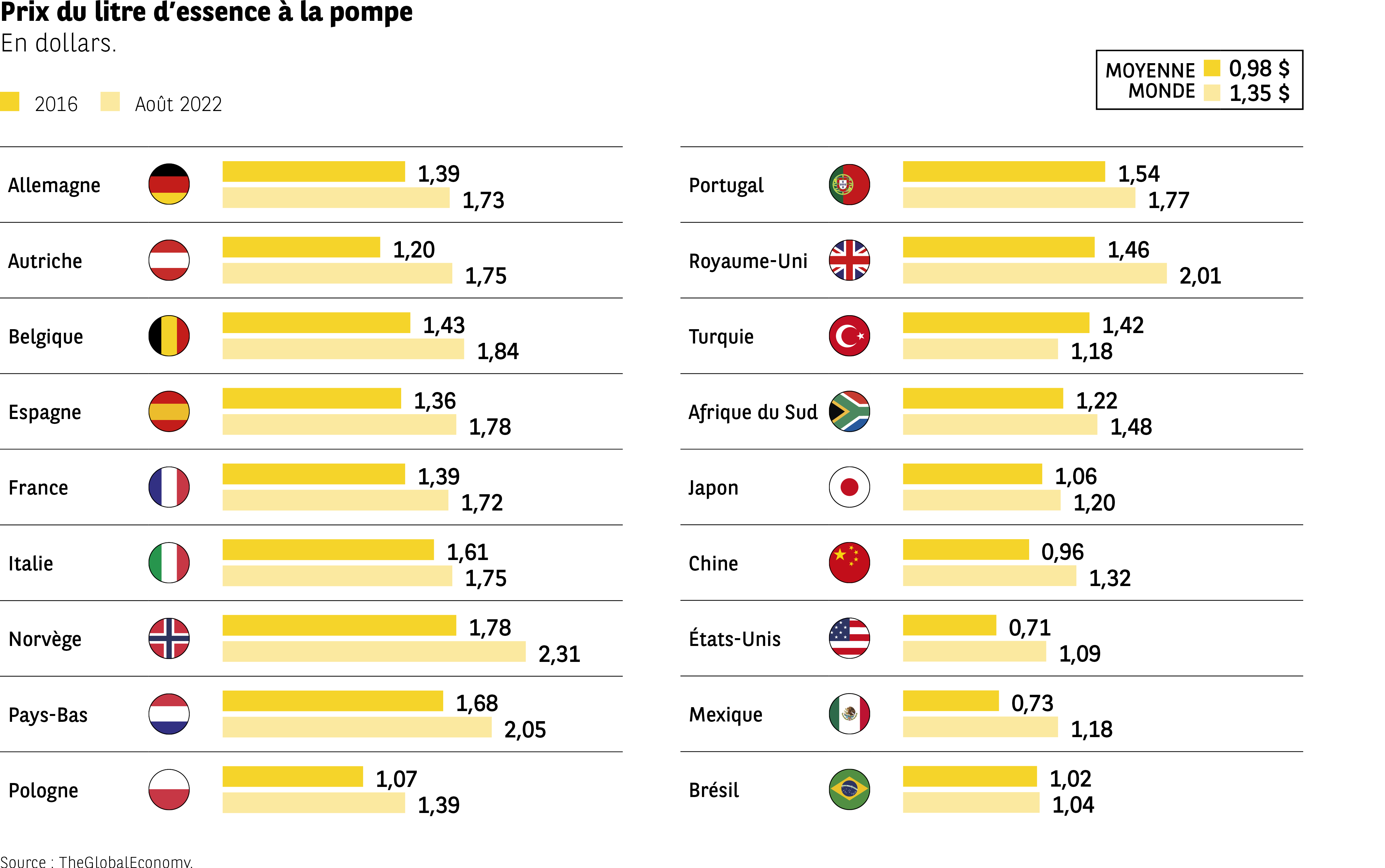 L’infographie affiche deux valeurs pour chaque pays : le prix du litre d’essence à la pompe en 2016 et en août 2022, exprimé en dollars.
