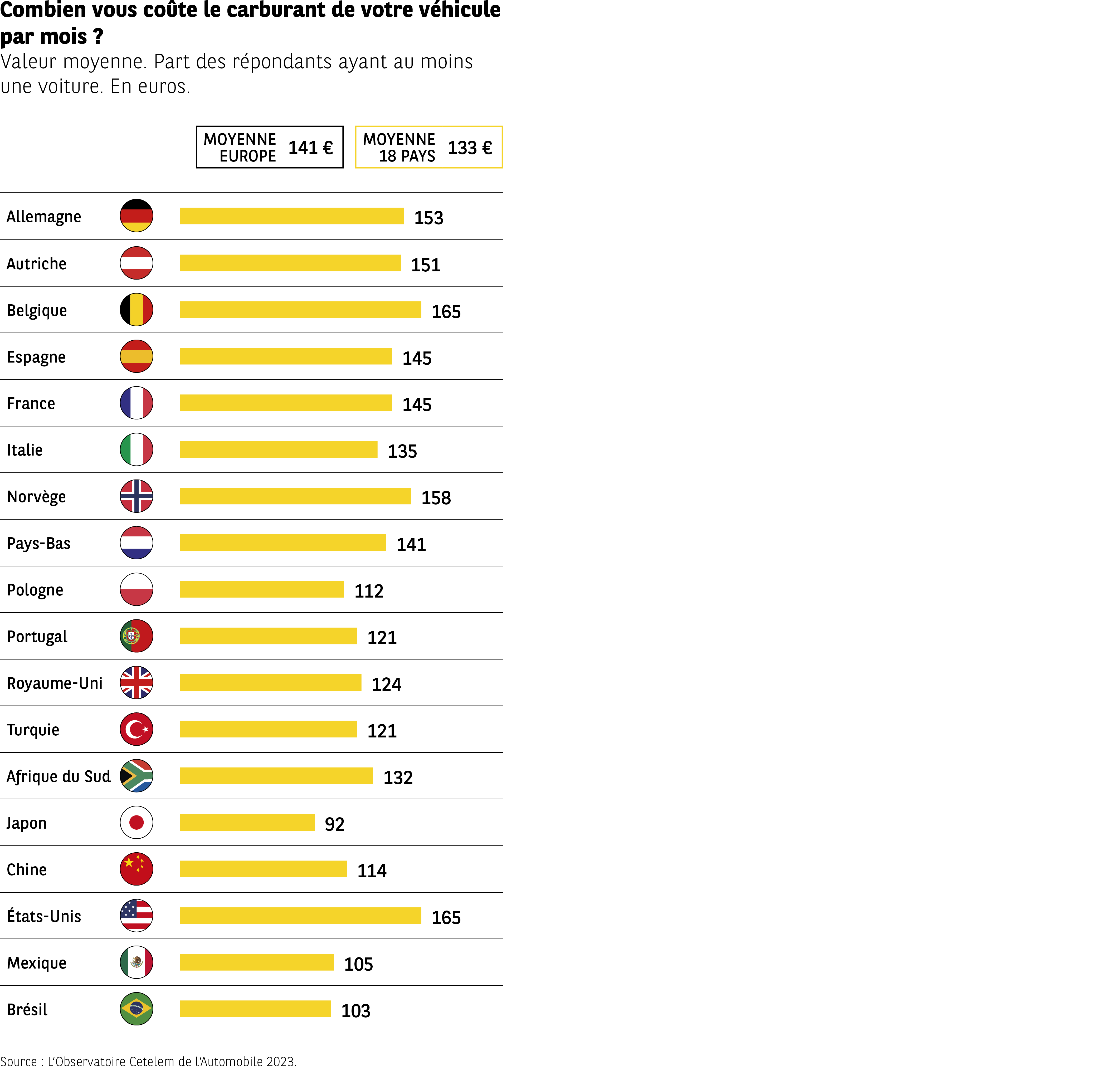 L’infographie présente les dépenses mensuelles moyennes en carburant pour les conducteurs de 18 pays. Les valeurs sont exprimées en euros.