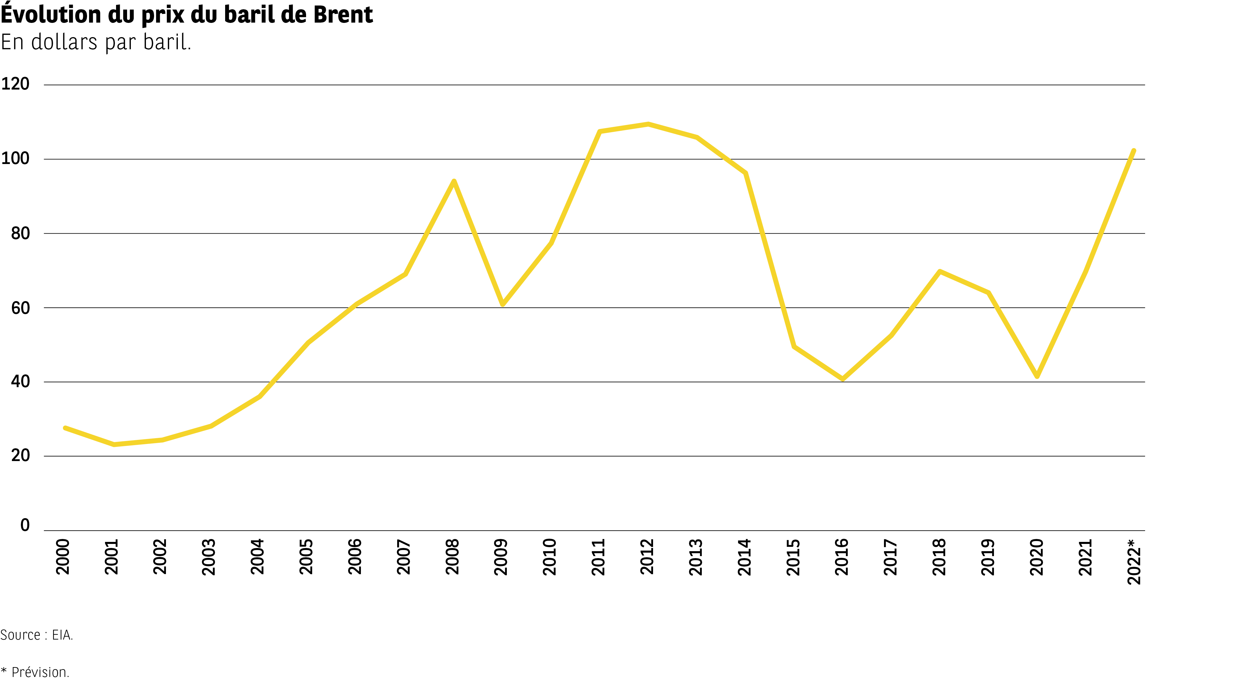 Une courbe jaune suit les variations annuelles. L’axe vertical s’étend de 0 à 120 dollars, l’axe horizontal indique les années de 2000 à 2022. La valeur 2022 est notée comme une prévision (*).