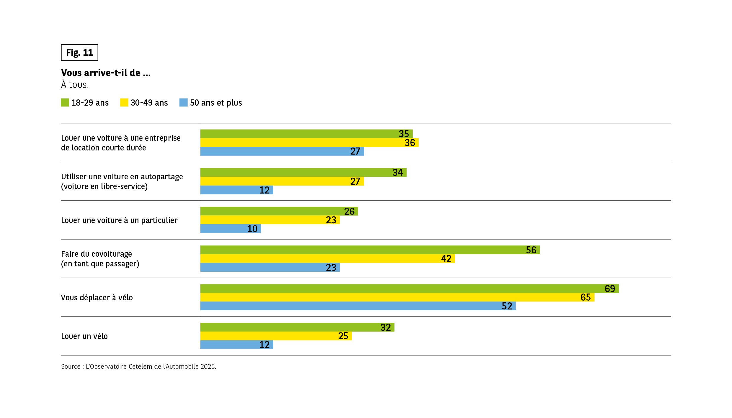 – Faire du covoiturage en tant que passager : 18-29 ans 56 %, 30-49 ans 42 %, 50 ans et plus 23 %