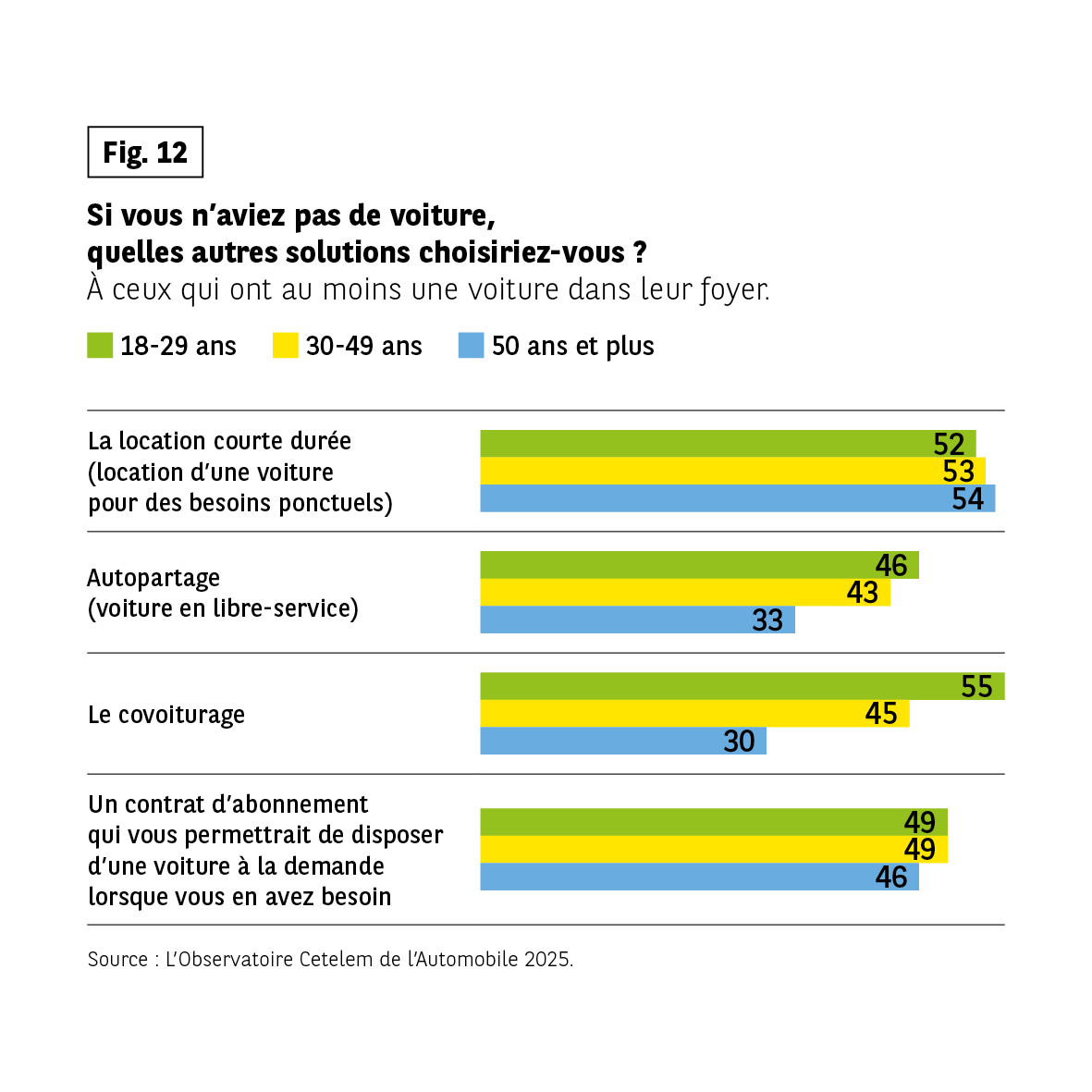 L’infographie présente les réponses à la question : « si vous n’aviez pas de voiture, quelles autres solutions choisiriez-vous ? », posée aux personnes disposant d’au moins une voiture dans leur foyer. Quatre solutions sont proposées : la location courte durée, l’auto partage, le covoiturage et un contrat d’abonnement permettant d’accéder à une voiture à la demande. Les résultats sont répartis selon trois tranches d’âge : 18-29 ans, 30-49 ans, 50 ans et plus.