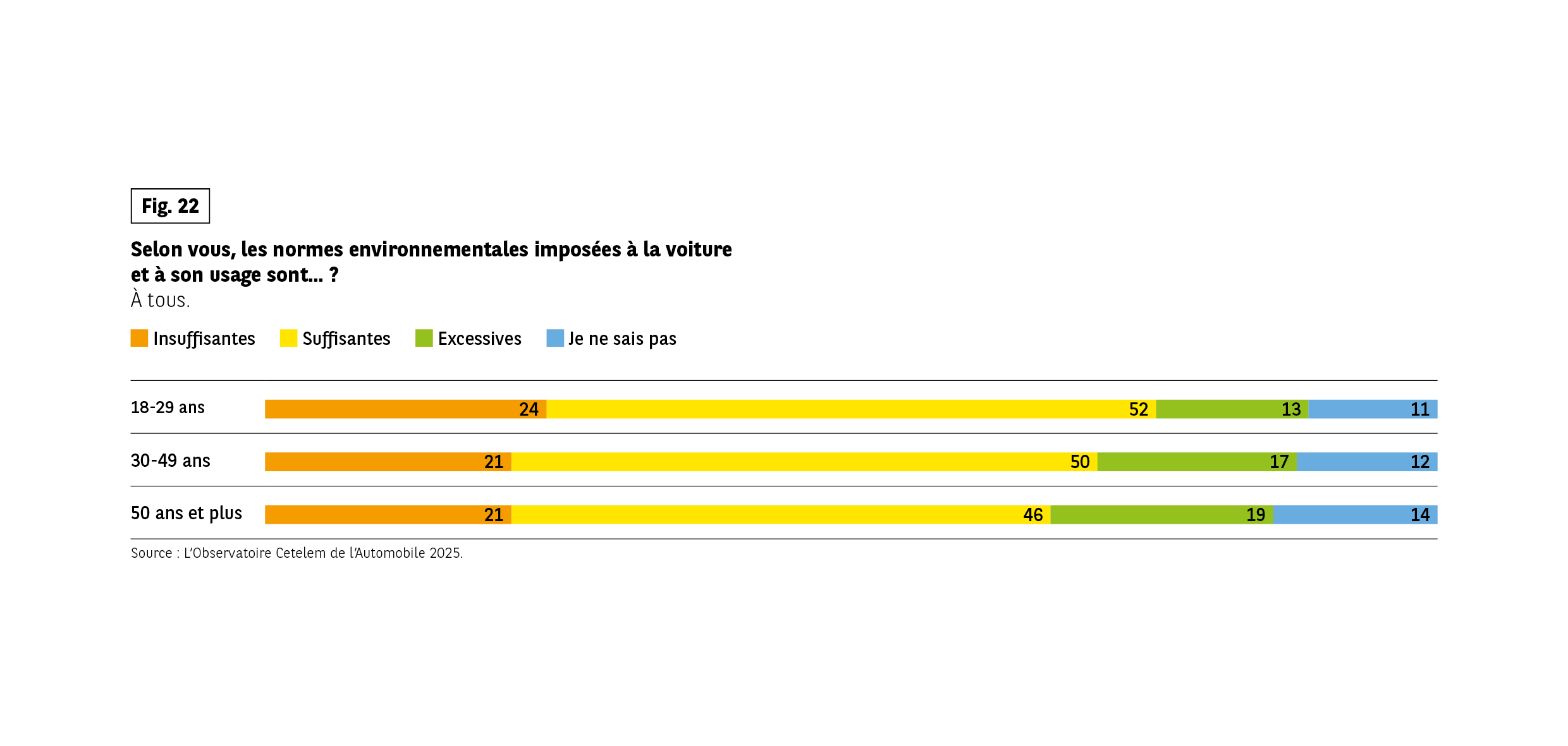 Les différences d’opinion générationnelles se manifestent à nouveau quand il s’agit d’envisager l’interdiction à la vente des voitures thermiques. Là encore, quelle que soit la tranche d’âge, aucune majorité ne prône cette décision. Seulement 39 % des jeunes s’y opposent contre 46 % des séniors. Les opposants sont deux fois plus nombreux en ville qu’à la campagne, ainsi que dans la plupart des pays européens. Les jeunes se montrent aussi un peu moins indulgents à propos des normes environnementales imposées à la voiture. Seuls 24 % les estiment insuffisantes, les séniors étant 21 % à l’affirmer. La moitié estime que les normes existantes suffisent. Comme on pouvait s’attendre, c’est en ville que le regard est le plus critique. Une fois encore la « culture » environnementale des jeunes, qui repose sur une meilleure information, peut expliquer ce résultat (Fig. 22).