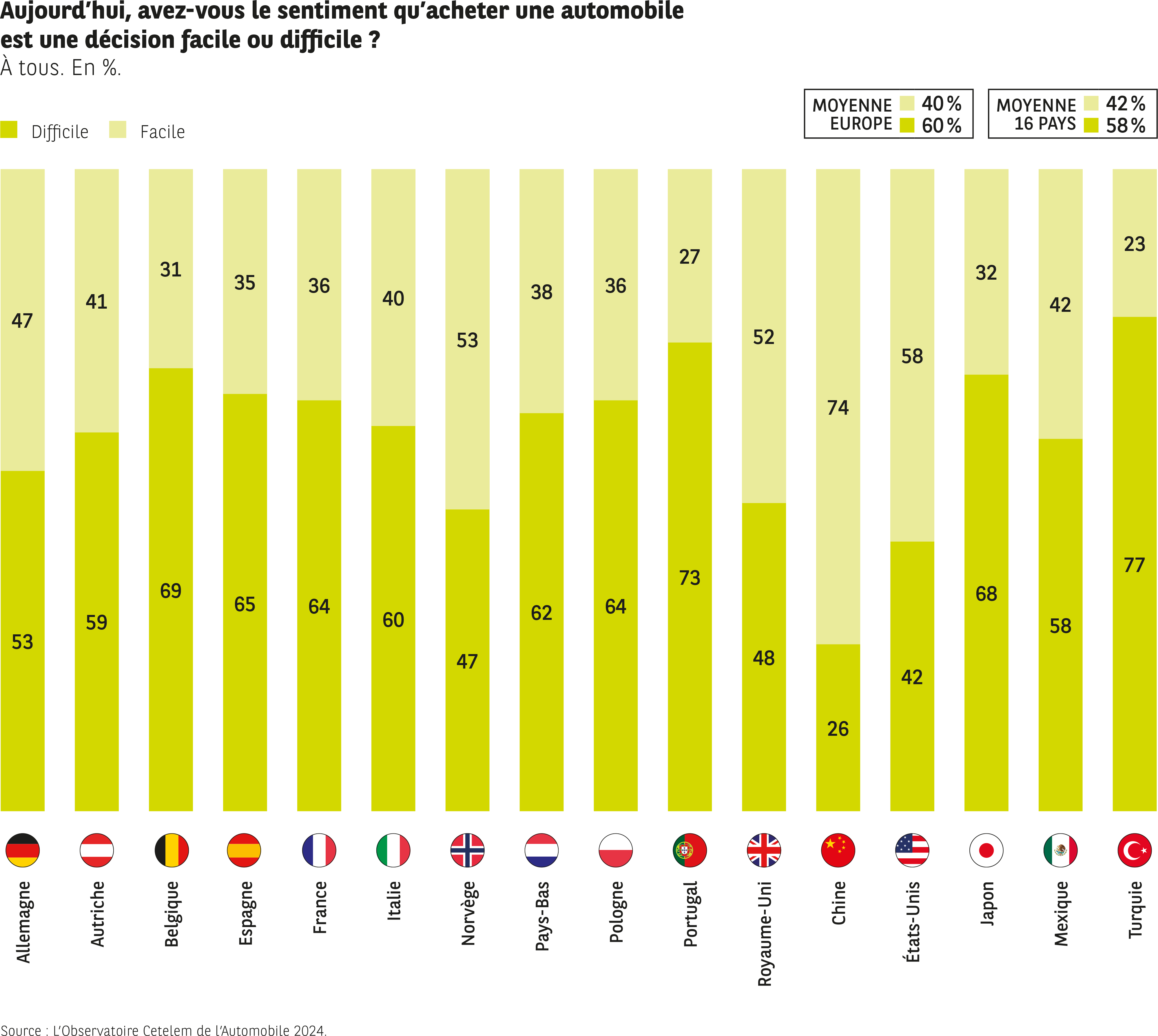 En revanche, c’est, de loin, en Chine où l’on se fait le moins de nœuds au cerveau avec les trois quarts des automobilistes qui placent cette prise de décision d’achat sous le sceau de la facilité. Les U.S.A, la Norvège et le Royaume-Uni rassemblent également une majorité pour partager cette conviction. Mais dans de nombreux pays, cette prise de décision est difficile.