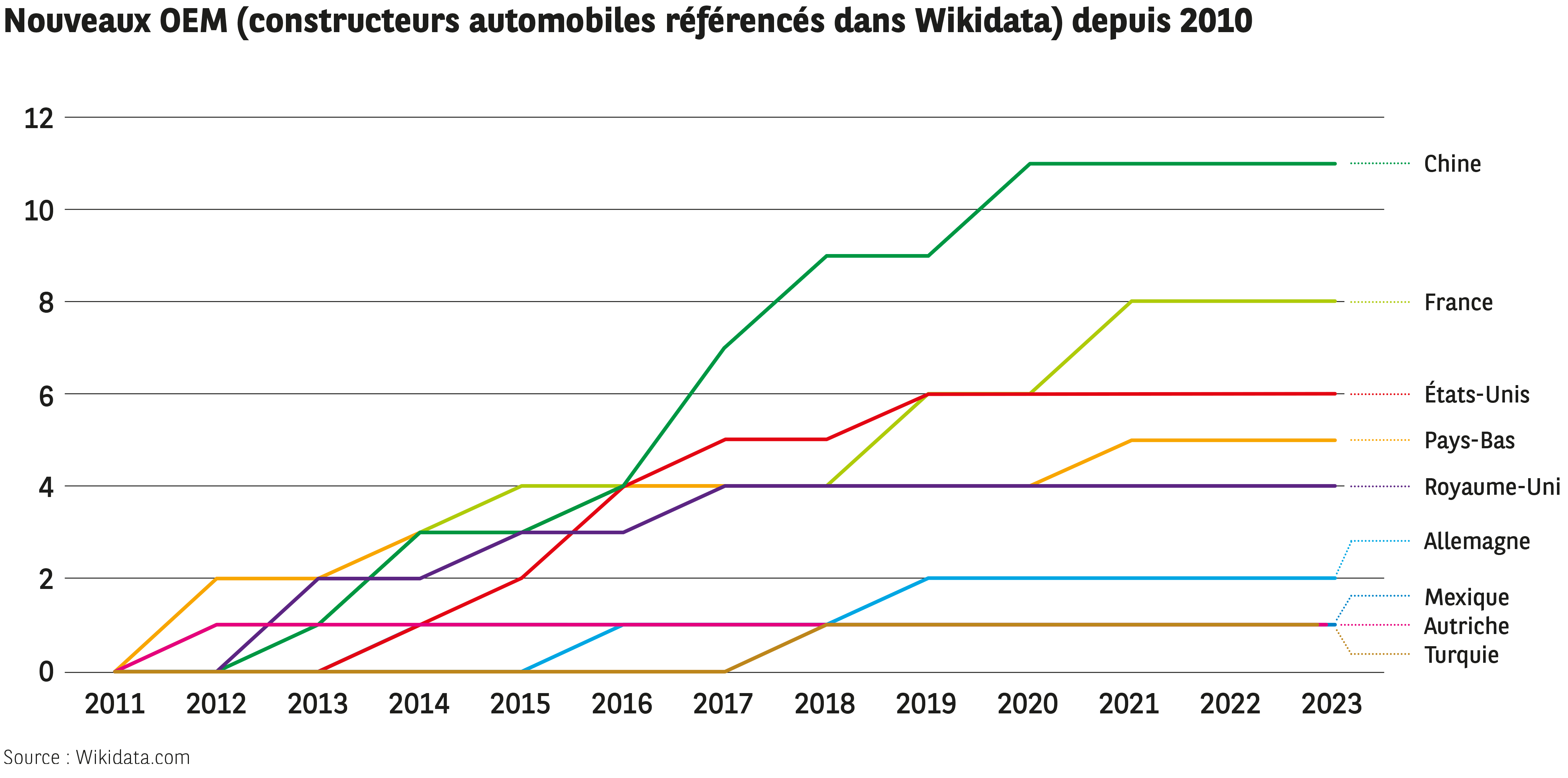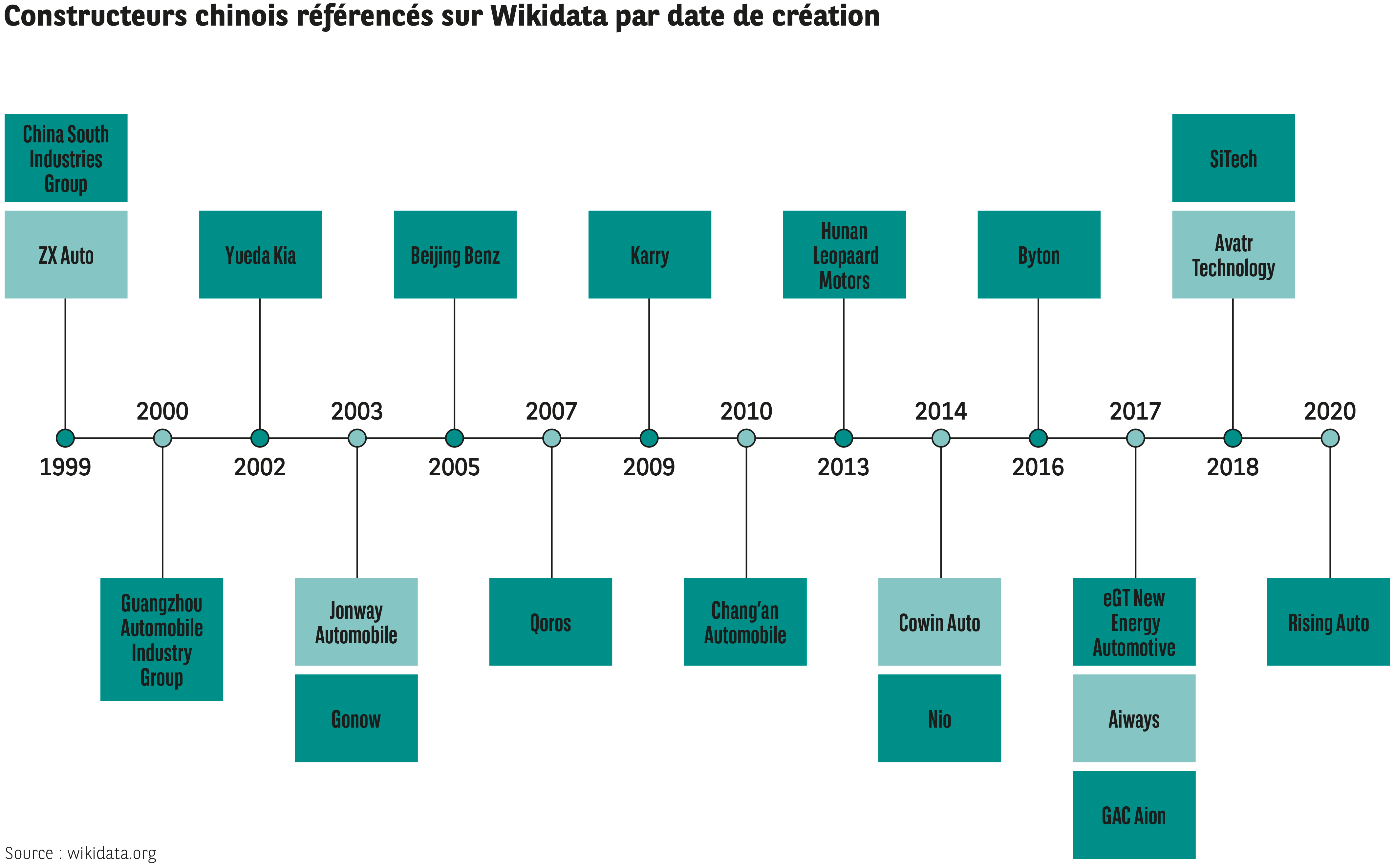 et de ses marques. En un peu plus de 20 ans, plus de 20 marques ont vu le jour (Fig. 35). Des marques qui pour la plupart développent des modèles électriques. Sans parler des marques déjà présentes sur le marché qui, à l’instar de MG et davantage encore BYD, pure premium électrique, entendent le bousculer et séduire les automobilistes avec des véhicules électriques low cost, un oxymore jusqu’alors, proposés à des prix comparables à ceux des véhicules thermiques.