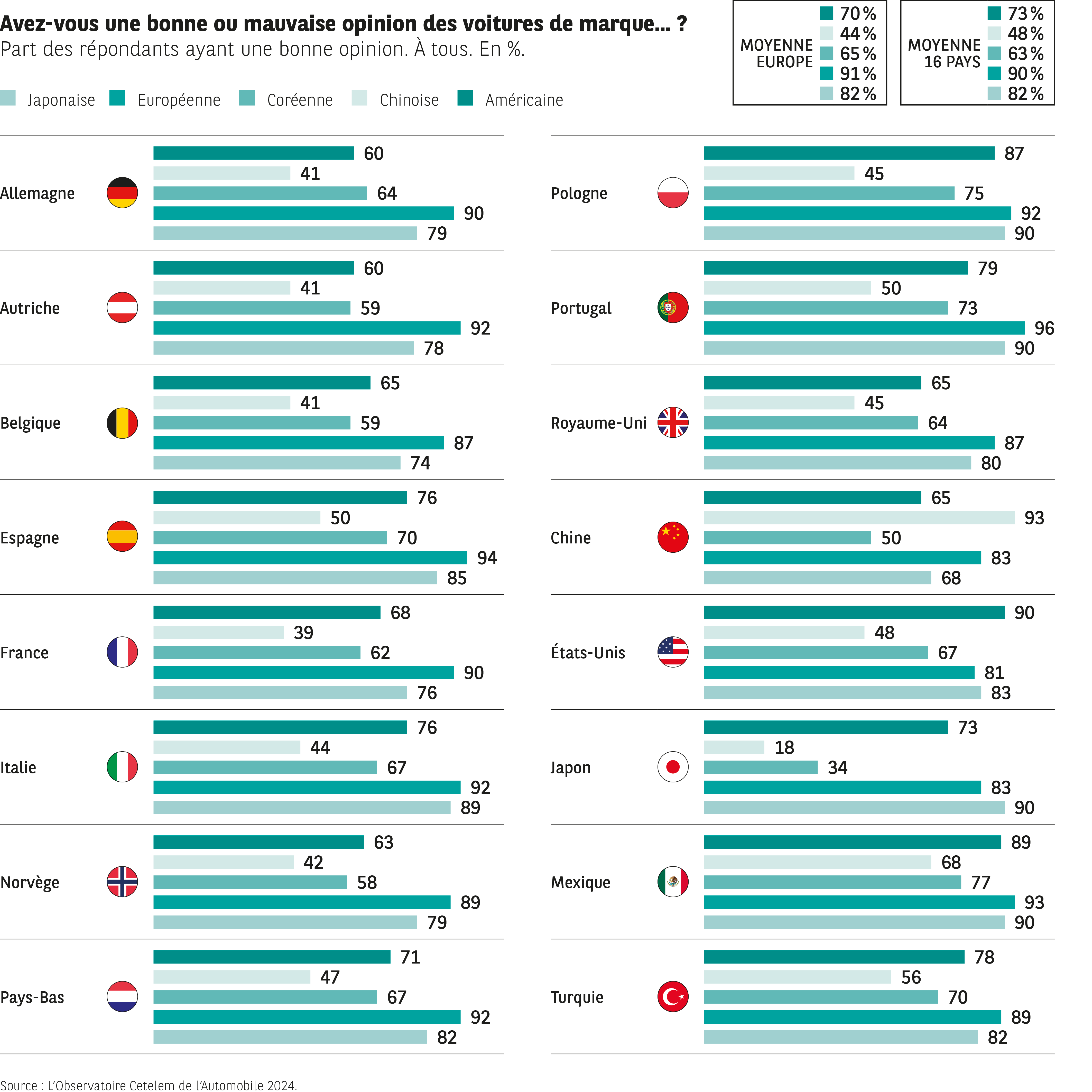 Face à ce quasi-plébiscite, les marques japonaises font plus que bonne figure avec 82 % d’opinions favorables. C’est naturellement au Japon mais aussi au Mexique, en Pologne et au Portugal que les automobilistes sont les plus enthousiastes. En Chine, logique géopolitique, les opinions favorables peinent à atteindre les 70 %.