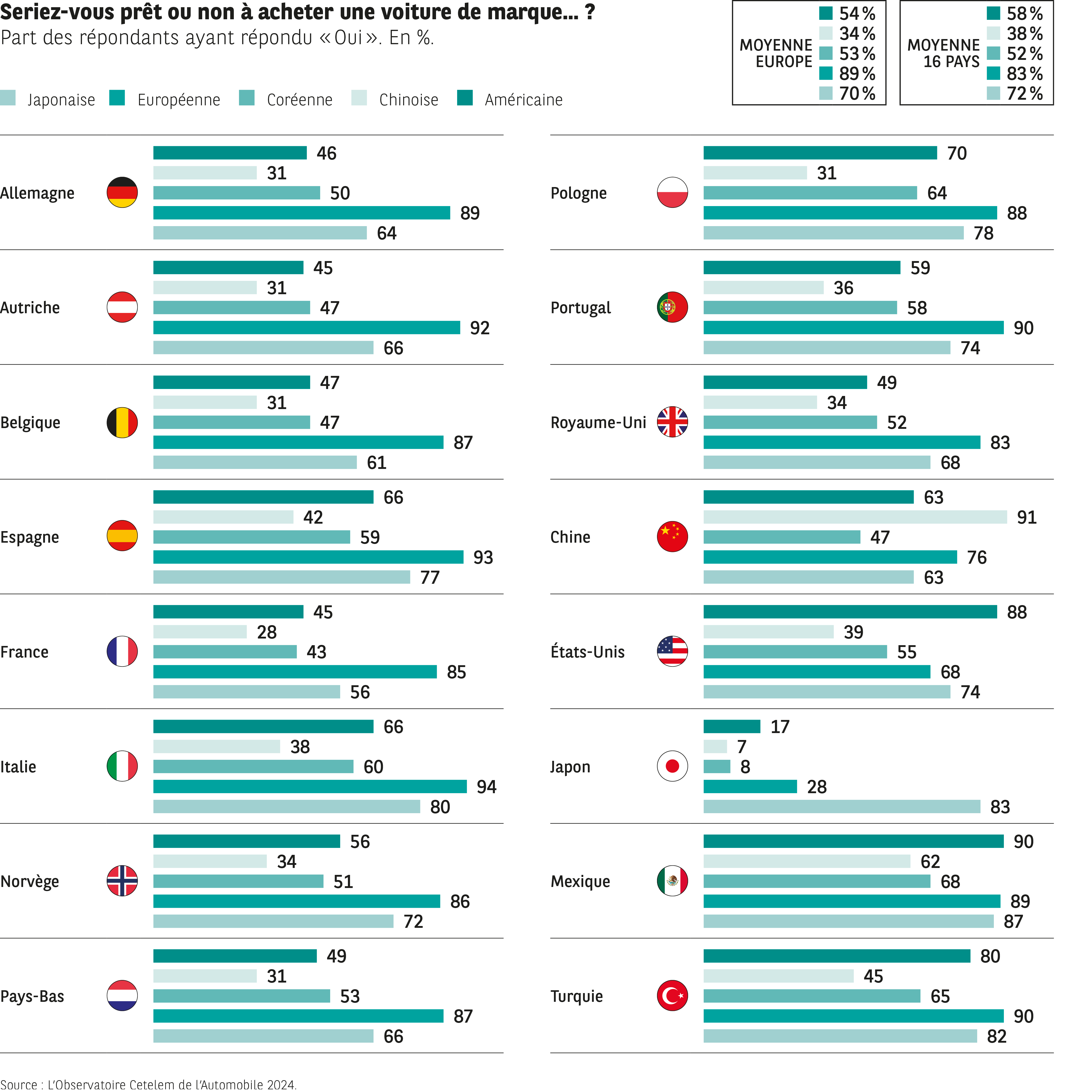 Un score qui constitue une base solide pour se développer, eu égard notamment aux efforts déployés pour améliorer la qualité des modèles et répondre à la demande des clientèles occidentales. Sans surprise, l’adhésion est totale en Chine et le rejet consommé au Japon, avec des scores respectifs de 93 % et 18 %. Entre ces deux extrêmes, la plupart des pays européens affichent des résultats inférieurs à la moyenne globale, la mise en évidence d’une méfiance à l’égard des marques chinoises.
