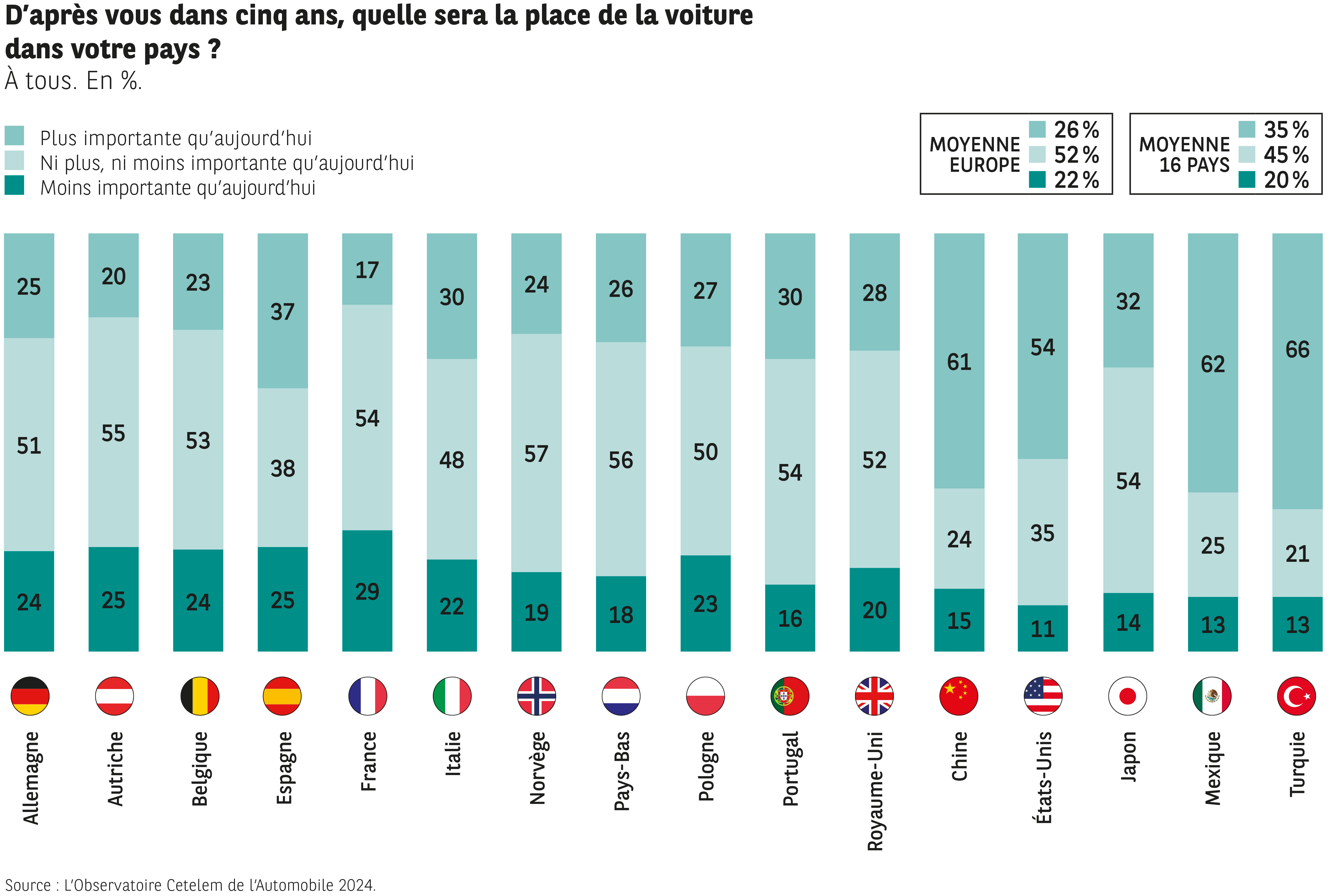 Côté thuriféraires d’une voiture résiliente et omniprésente, on retrouve notre traditionnel quatuor associant Chine, États-Unis, Mexique et Turquie, les seuls pays où le sentiment que la voiture sera présente davantage demain dépasse les 50 %.(Fig. 17).