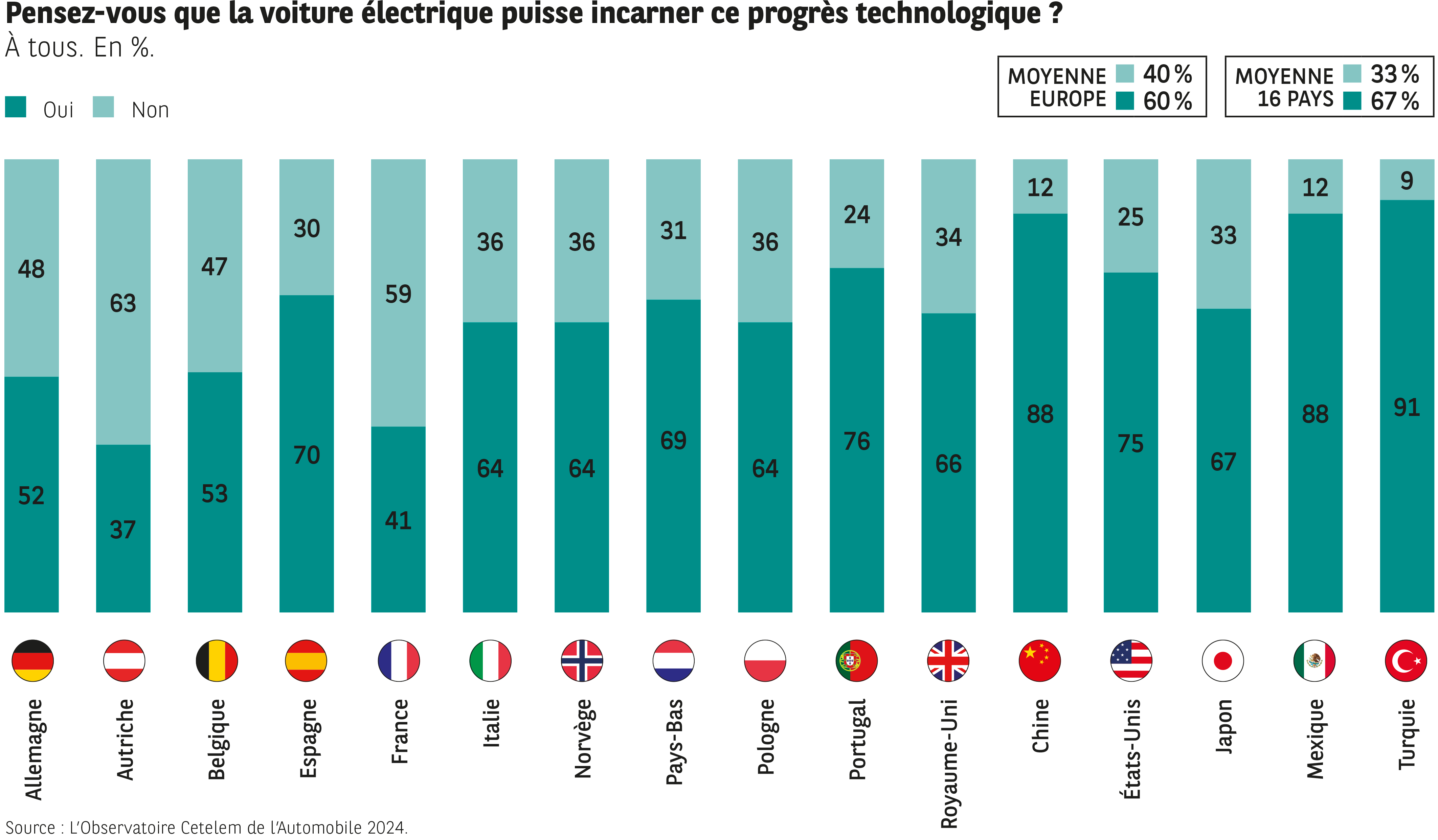 Et quoi de mieux que la voiture électrique pour concilier à la fois progrès vertueux et garantie de pouvoir circuler ? Près de 7 personnes sur 10 voient dans ce type de véhicule l’incarnation du progrès technologique. Cependant, cette moyenne cache des écarts prononcés entre les pays, rarement entrevus jusqu’alors dans cette étude, qui soulignent que la « solution électrique » est loin d’être une évidence pour tout le monde.