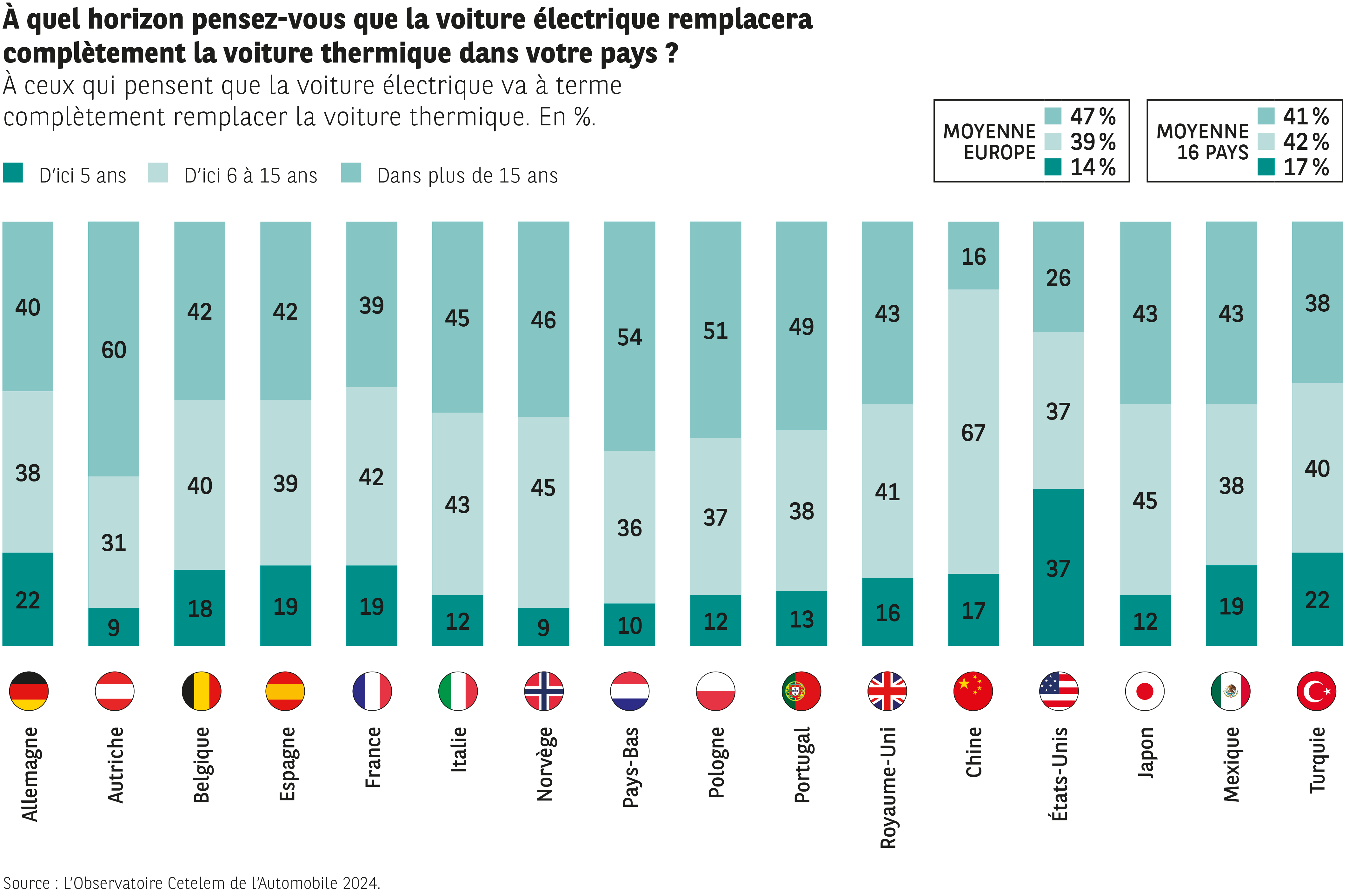 Cette « résistance » géographique à l’électricité se confirme lorsqu’on demande aux automobilistes de se projeter dans un futur automobile totalement électrique, les disparités étant à nouveau marquées. Les Autrichiens et les Français se montrent encore circonspects, avec moins de 4 personnes sur 10 à envisager un tel changement.