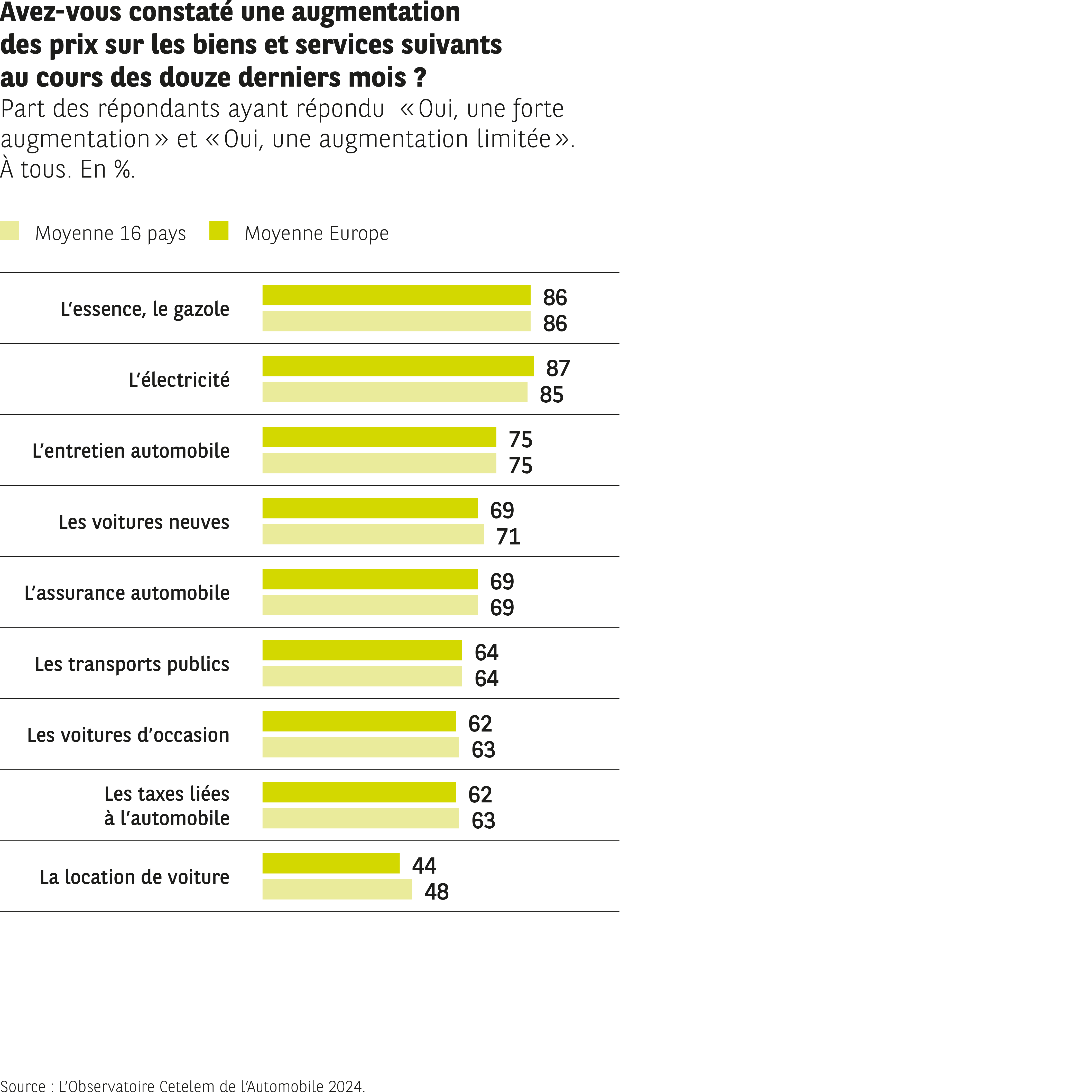 Graphique en barres montrant, pour plusieurs postes liés à l’automobile, la proportion de répondants ayant constaté une hausse des prix au cours des douze derniers mois. Graphique horizontal présentant les réponses à la question « Avez-vous constaté une augmentation des prix des biens et services suivants au cours des douze derniers mois ? ». Les barres vertes correspondent aux moyennes de 16 pays observés. Les postes évalués (et leur pourcentage de personnes déclarant une hausse) sont : Essence et gazole : 86 % Électricité : 85 % Entretien automobile : 75 % Les voitures neuves : 71 % Assurance automobile : 69 % Transports publics : 64 % Voitures d’occasion : 63 % Taxes liées à l’automobile : 62 % Location de voitures : 44 % Le graphique révèle que tous les postes sont perçus comme en hausse, et très fortement pour carburants et électricité. Source : Observatoire Cetelem Automobile 2024.