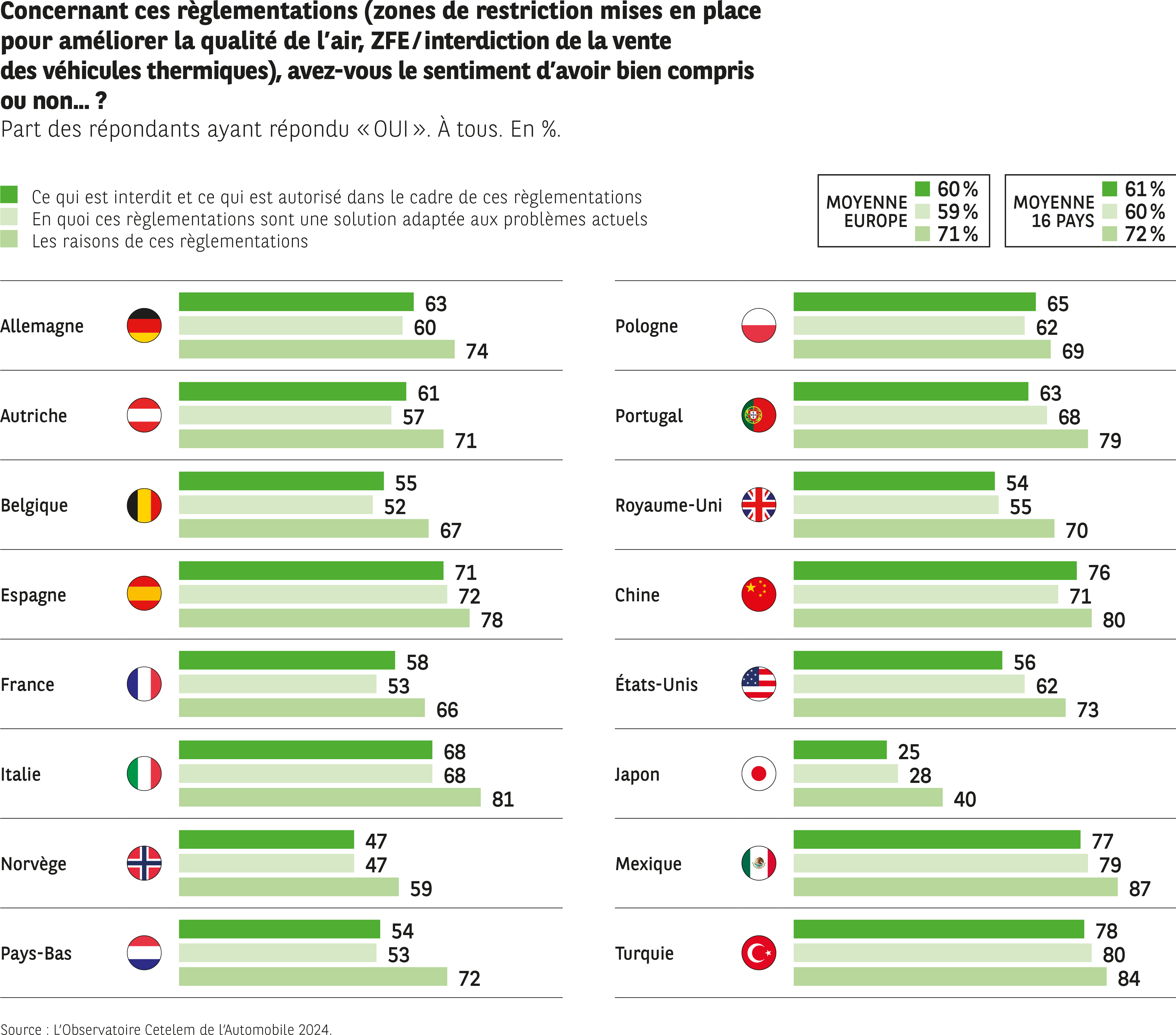 Face à cette jungle réglementaire, on ne peut que saluer la clairvoyance des automobilistes. 6 personnes interrogées sur 10 jugent qu’elles sont une solution aux problèmes actuels. Turquie, Mexique et Chine sont une fois encore les plus nombreux à partager cette compréhension avec l’Espagne, le Portugal et l’Italie (autour de 80 %). Au contraire, les Japonais divergent nettement sur ce point de vue (72 % ne comprennent pas). Le Japon est d’ailleurs le seul pays avec la Norvège où les « non » l’emportent sur les « oui ». En France, il se dégage une faible majorité dans le clan des « oui ».