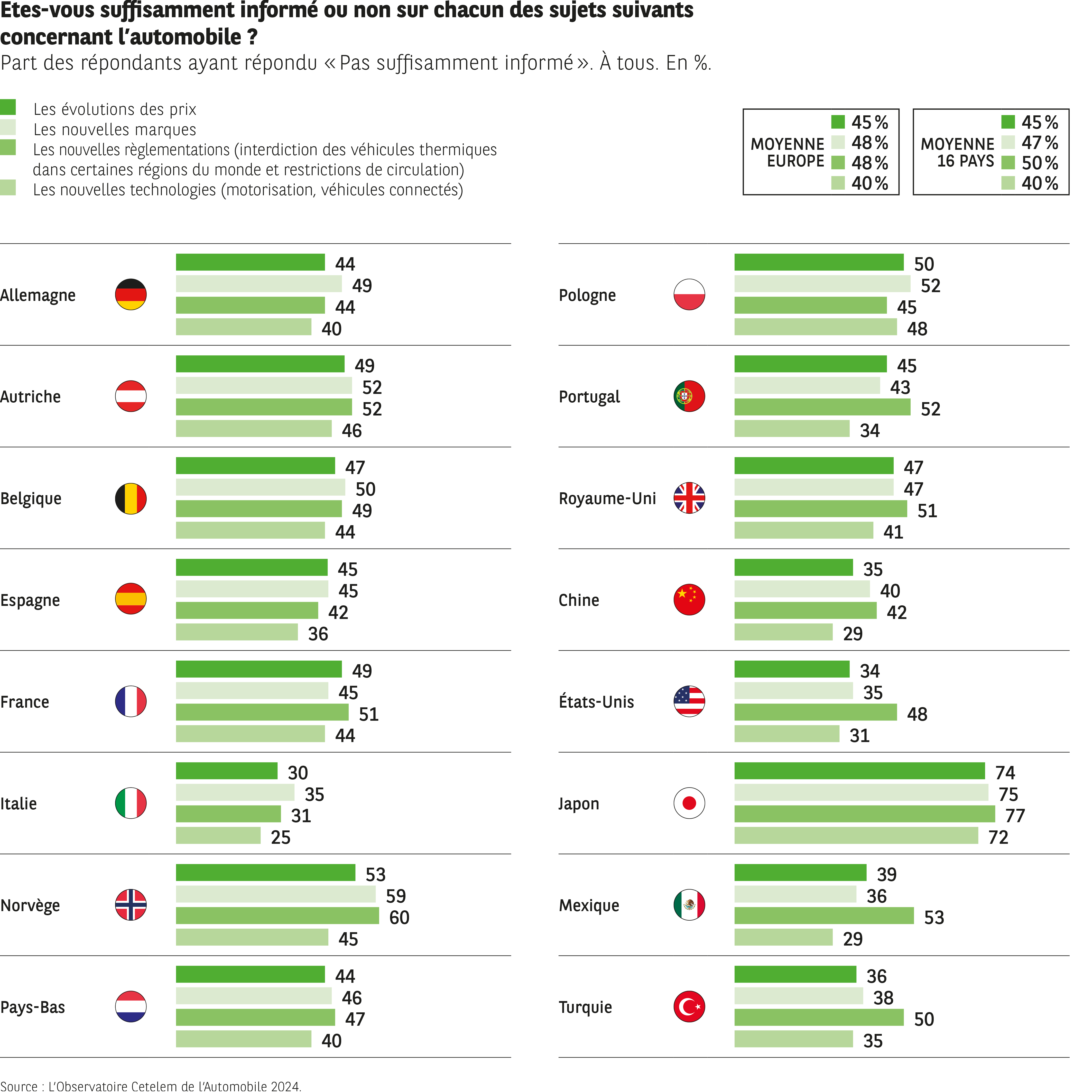Dans le détail, 1 personne sur 2 pointe en premier lieu un manque d’information concernant les nouvelles règlementations à propos des motorisations et de la circulation. Un flou particulièrement ressenti au Japon bien sûr, mais aussi en Norvège. À l’inverse, les Italiens ainsi que les Chinois et les Espagnols s’estiment au clair sur cette question.
