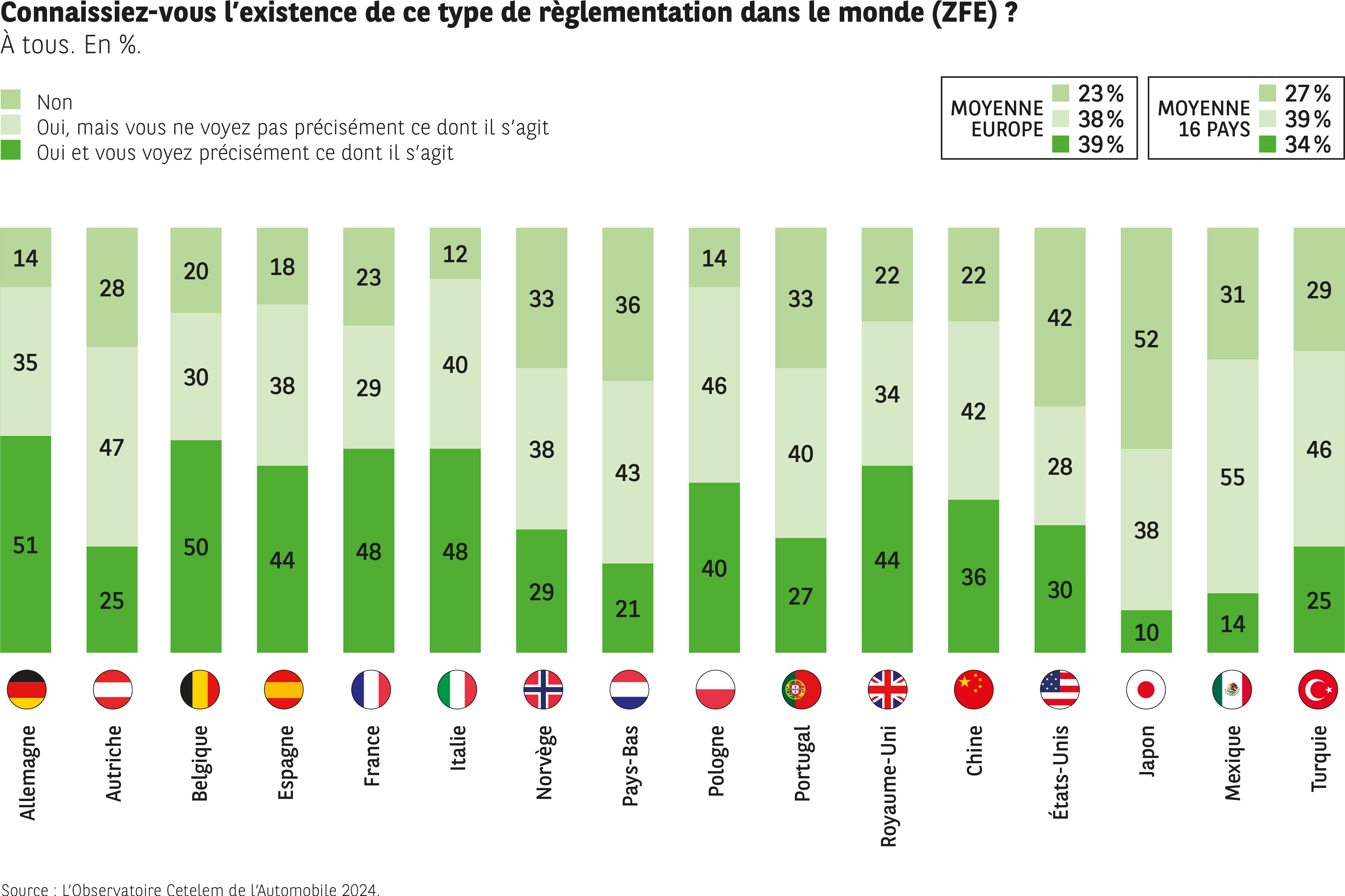 Mais les automobilistes pensent-ils qu’elles existent réellement, ces ZFE ? Là encore, une légère brume entoure les automobilistes. Seulement 4 sur 10 affirment qu’elles sont bien présentes dans leur pays. La raison est pourtant sauve. C’est en Allemagne, Belgique, Royaume-Uni et aussi en France que l’on recense les scores les plus élevés, nations qui ont mis en place des ZFE ou envisagent leur déploiement.