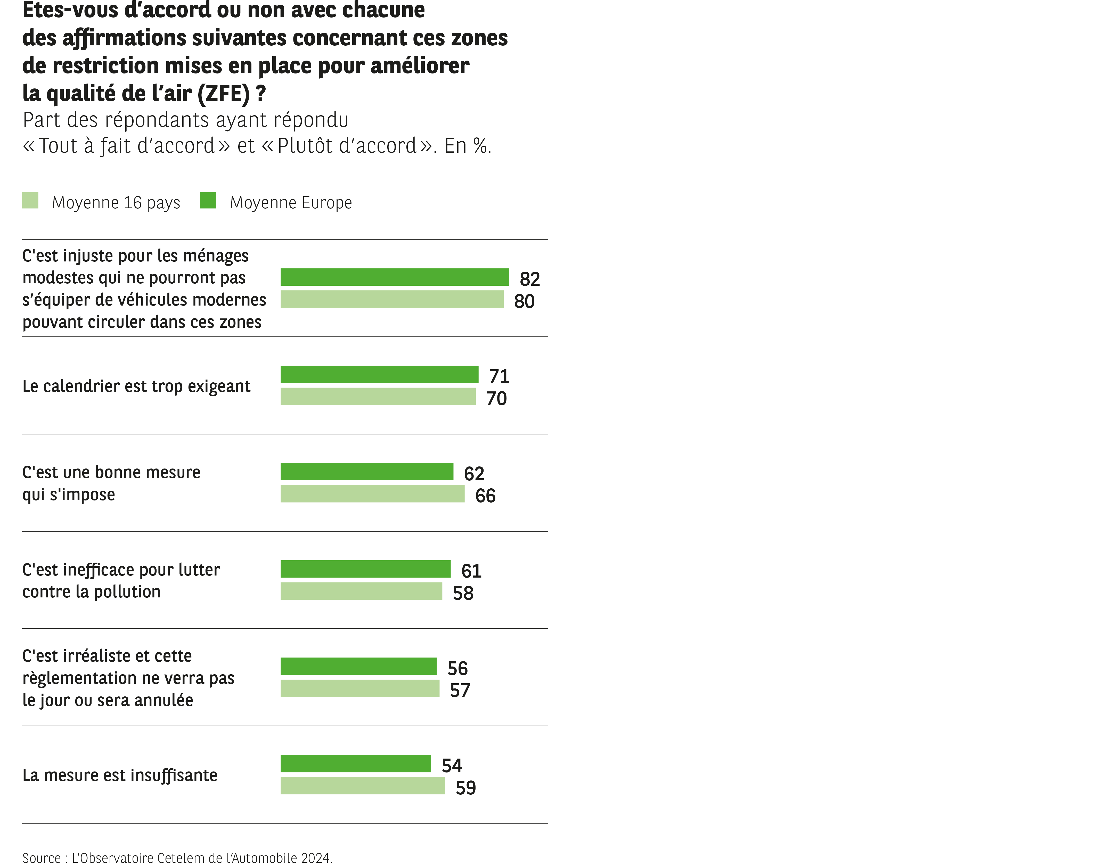 D’abord et avant tout, cette mesure est jugée comme injuste pour les ménages aux faibles revenus par 8 personnes sur 10, soulignant une fois encore l’importance du critère financier pour ce qui a trait à l’automobile. Comme un écho de la crise des gilets jaunes, née d’une décision politique touchant à la voiture et au porte-monnaie, les Français sont les plus nombreux à critiquer l’impact financier des ZFE (85 %).