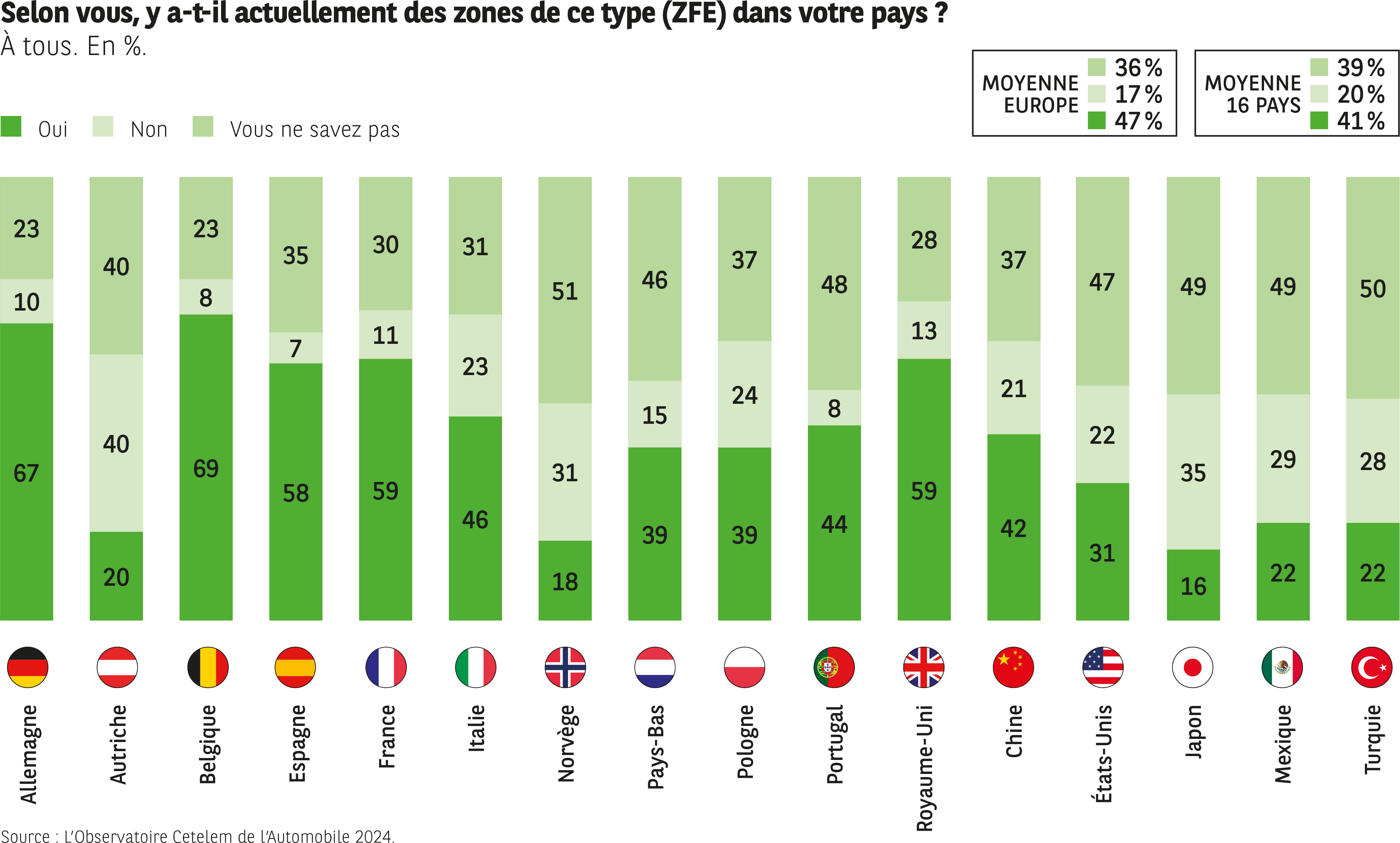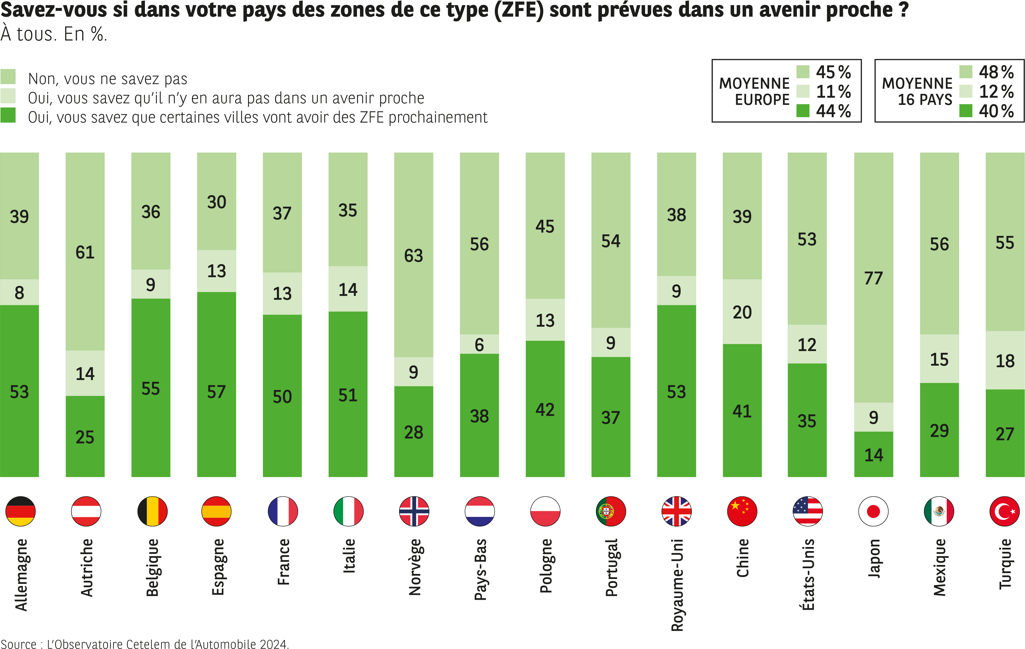 Certes, 66 % des personnes interrogées pensent que c’est une bonne mesure. Il faut se rendre dans les pays où les ZFE sont les plus implantées, et depuis longtemps, pour trouver une forte proportion de réfractaires, dont la moitié des Belges et des Français. À l’inverse, près de la moitié des Turcs et des Mexicains sont tout à fait d’accord avec cette idée alors qu’ils étaient les moins nombreux à s’en faire une opinion précise, un signe de l’intérêt pour cette mesure dans deux pays où les ZFE n’existent pas encore.