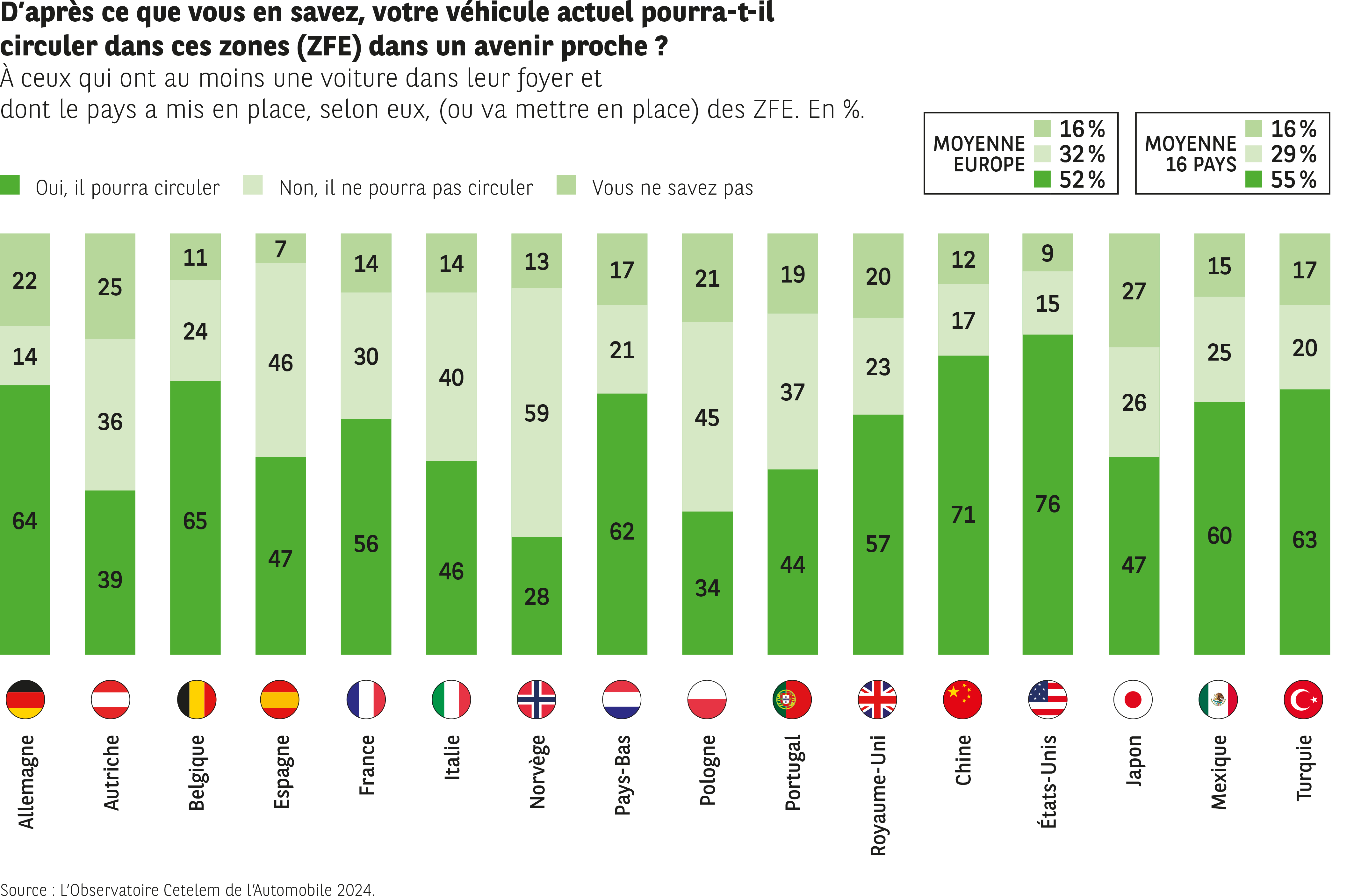 Étonnamment, la Norvège « électrique » voit 6 sur 10 de ses concitoyens affirmer que leur véhicule sera mis au ban des ZFE. Un score très supérieur