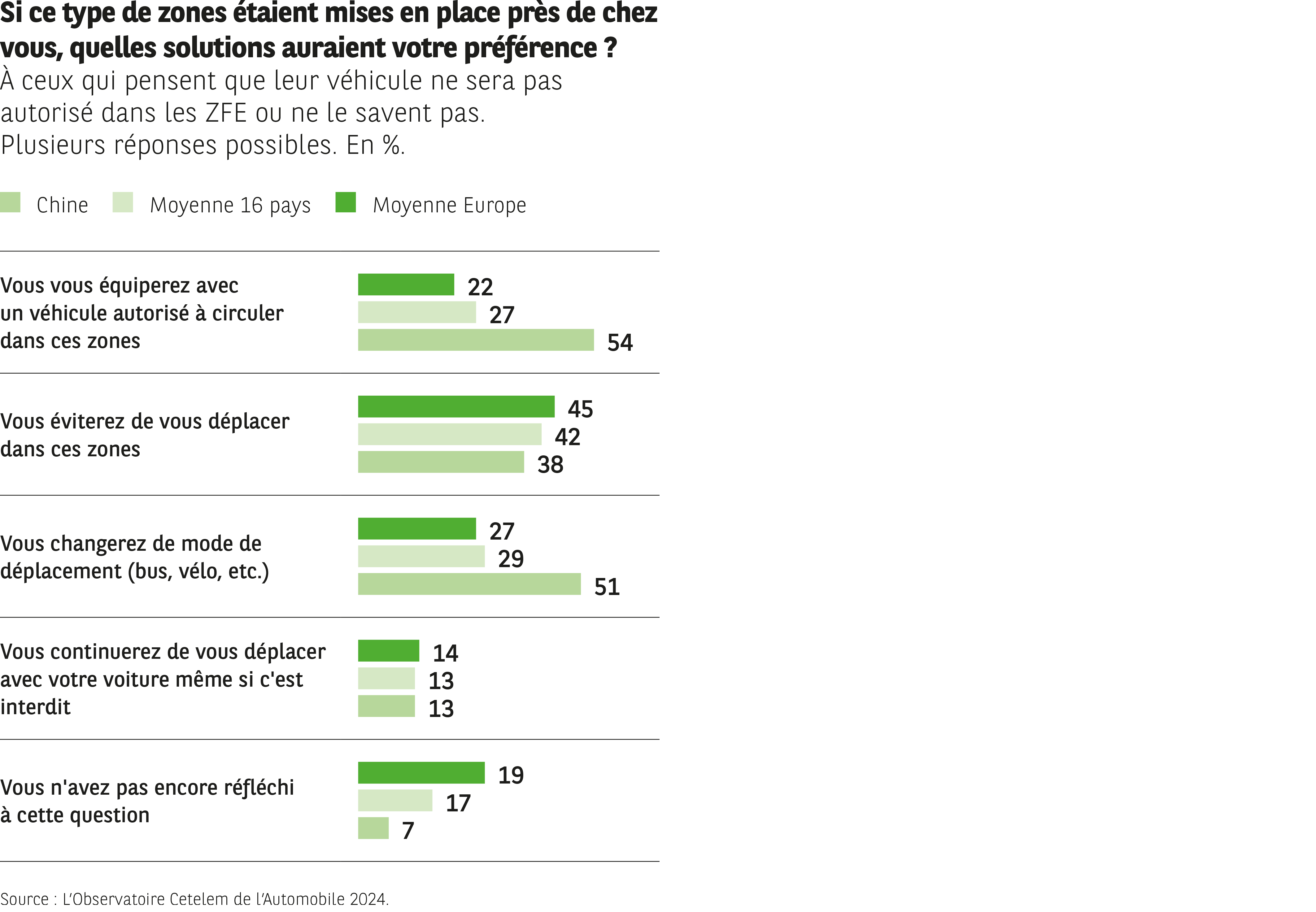 Paradoxalement, si les ZFE constituent une mesure conceptuellement juste, on les estime insuffisantes. Nous retrouvons à nouveau les Turcs pour occuper les premiers rangs (85 %) avec les Chinois et les Italiens comme principaux soutiens. Chez les voisins Néerlandais et Belges, cette opinion est deux fois moins partagée.