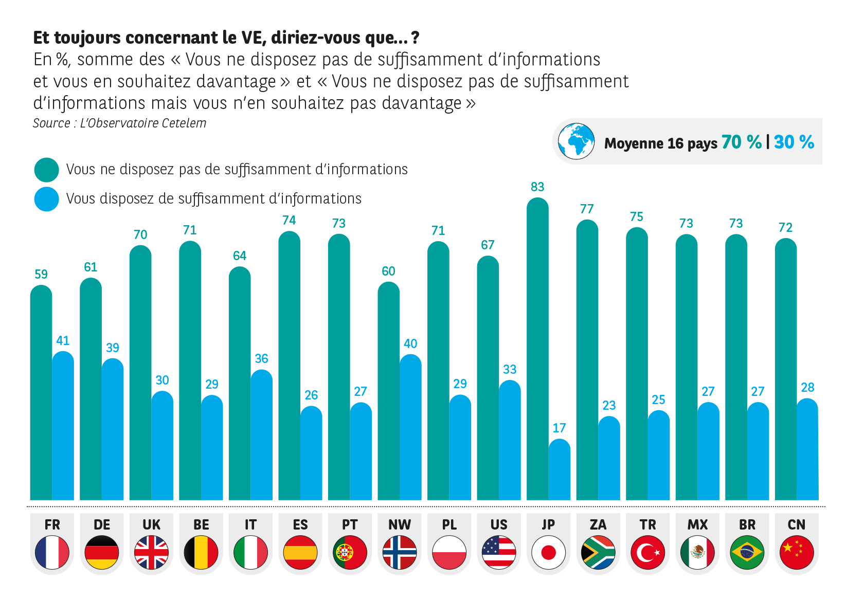 Ce manque d’informations culmine même à 83 % au Japon, pays des constructeurs Nissan et Toyota, très présents sur le marché du VE et de l’hybride. L’apport d’informations tous azimuts concernant les performances réelles du véhicule électrique, l’existence d’aides publiques à l’achat et les retours d’expérience des premiers utilisateurs seront de nature à faire évoluer la perception du véhicule électrique.