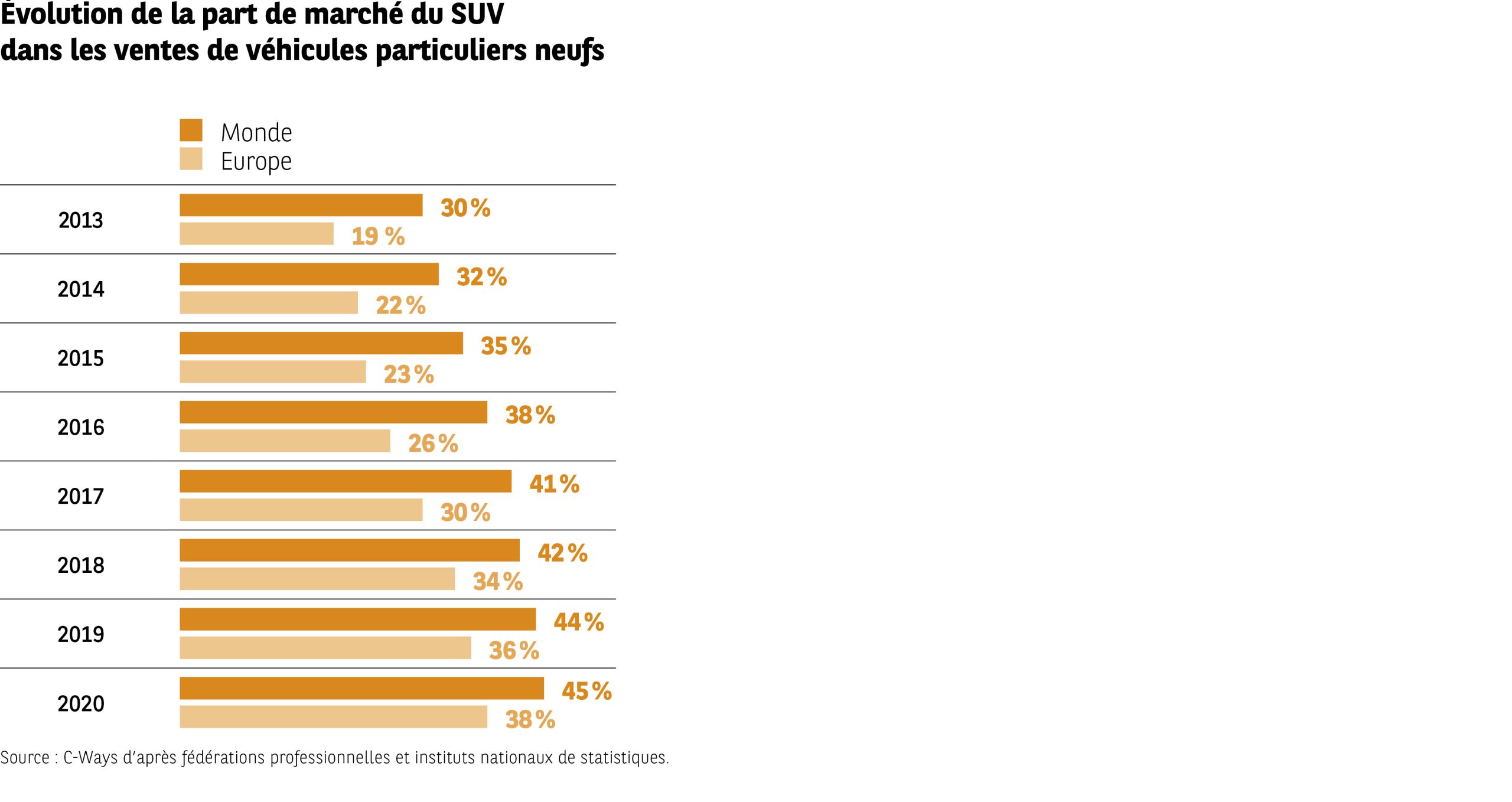 L’infographie illustre l’évolution de la part de marché des SUV dans les ventes mondiales et européennes de véhicules particuliers neufs entre 2013 et 2020.