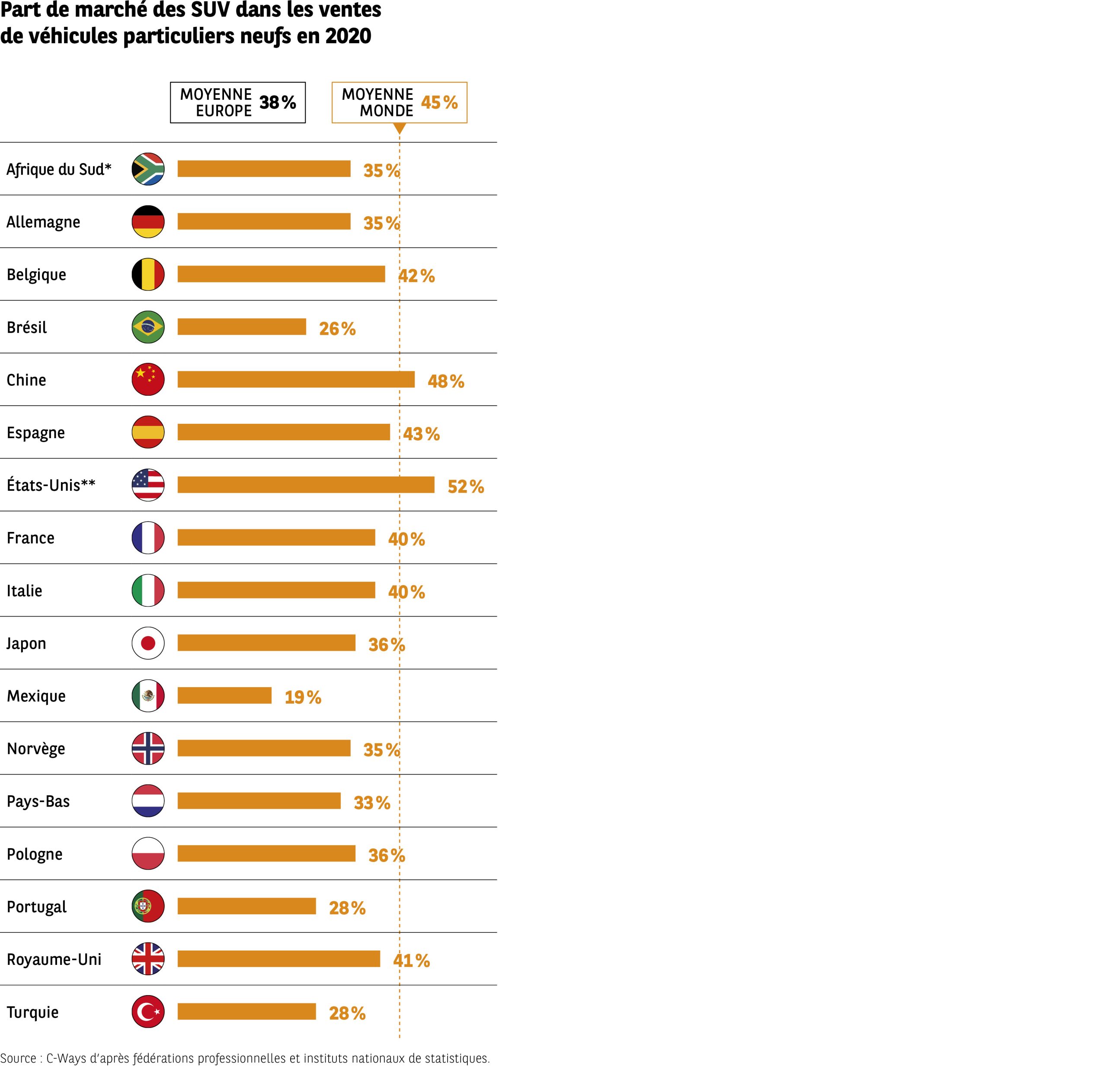 L’infographie compare la part de marché des SUV dans les ventes de véhicules particuliers neufs en 2020. Deux repères sont fournis : moyenne Europe 38 %, moyenne monde 45 %.