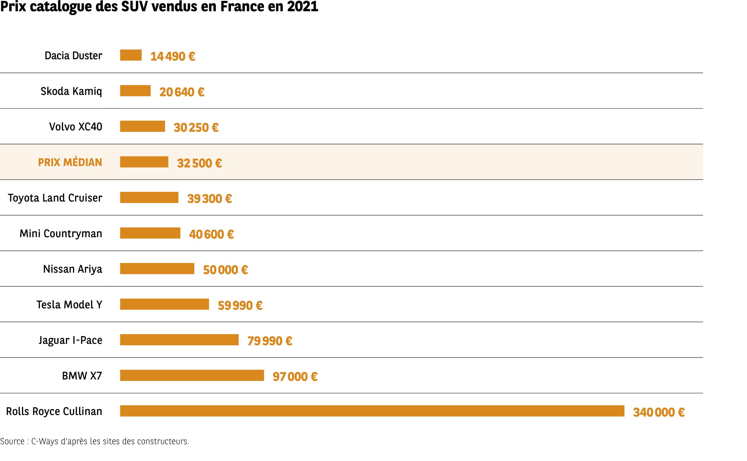 L’infographie affiche les prix catalogue de différents SUV vendus en France en 2021.