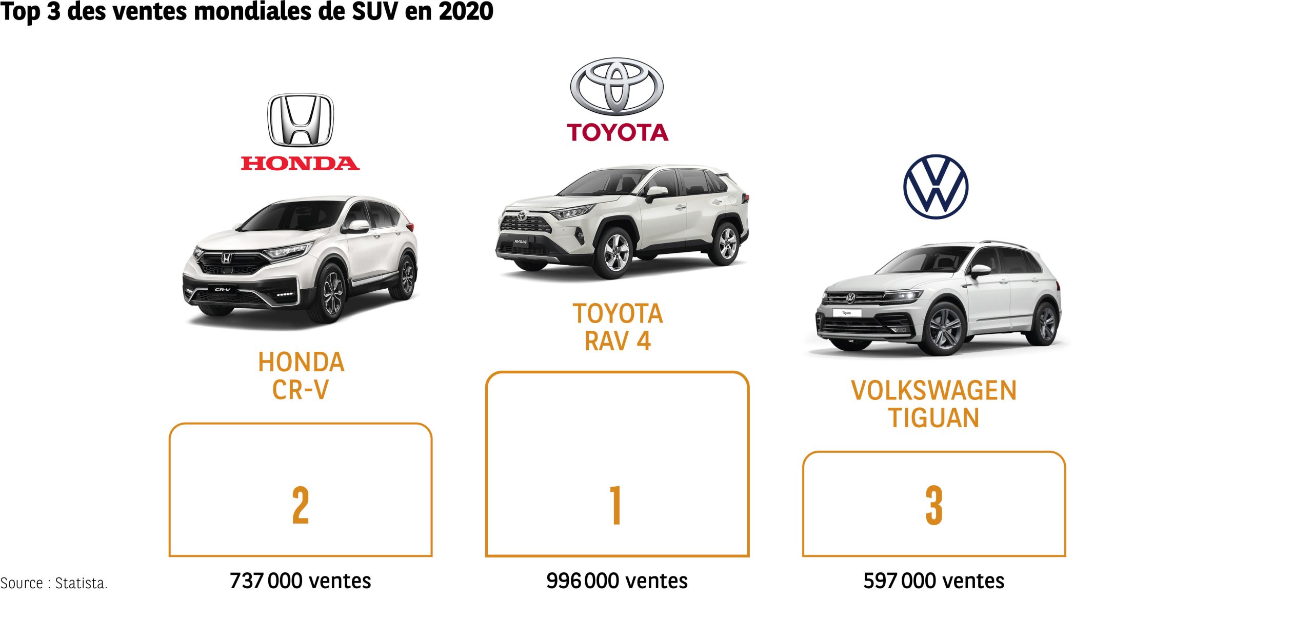 L’infographie présente le top 3 mondial des ventes de SUV en 2020, avec le volume de ventes annuel pour chaque modèle.