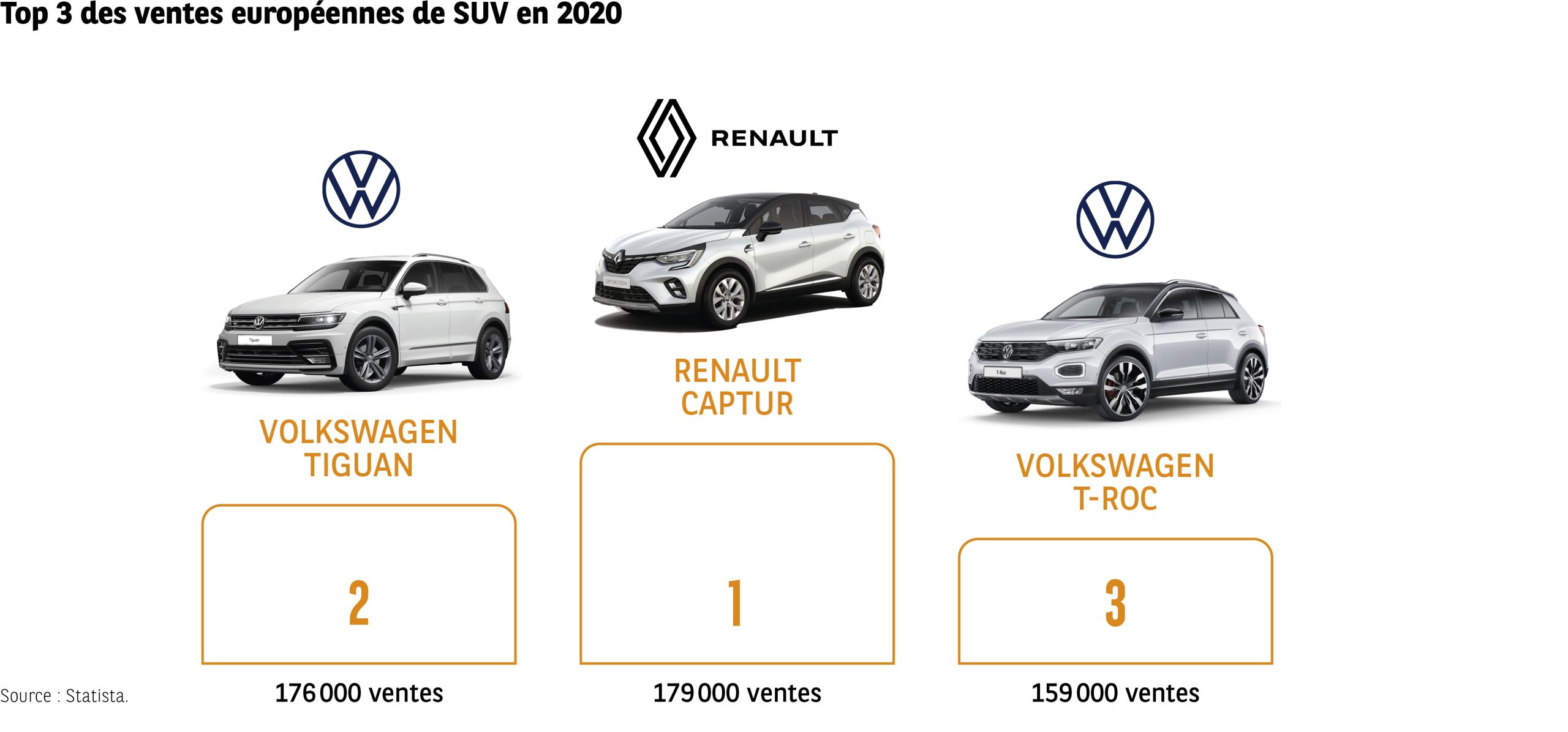 L’infographie présente le top 3 des ventes de SUV en Europe en 2020, avec volumes associés.