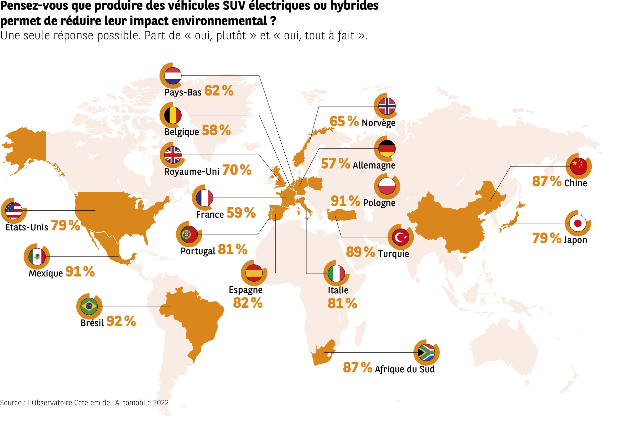 Une question particulièrement sensible dans les pays émergents, en Italie et en Espagne. La Norvège, pays de la voiture électrique, les Pays-Bas, le Royaume-Uni et le Japon sont moins concernés par cette problématique. Mais il faut voir derrière cette préoccupation une dimension essentiellement économique et pas vraiment environnementale. Seulement 23 % des possesseurs de SUV ont hésité à l’acheter, confrontés au potentiel impact environnemental de ce type de véhicule.