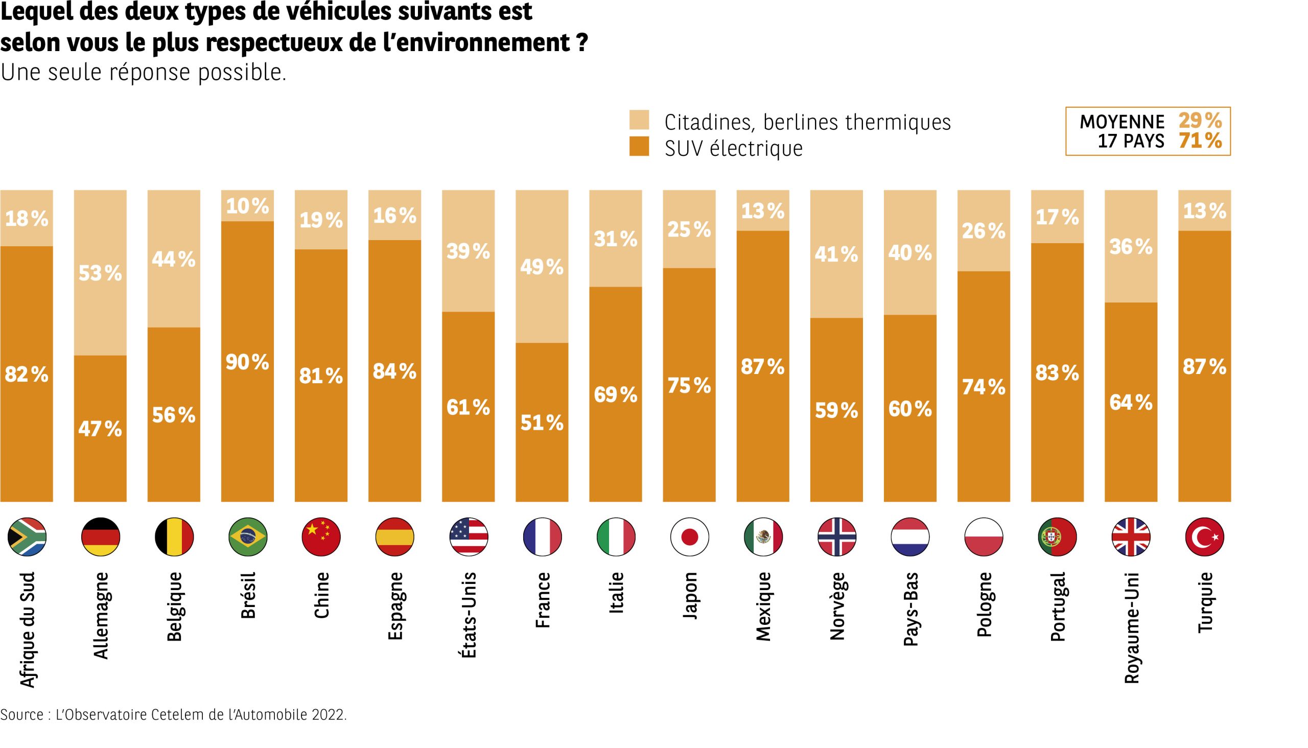L’infographie montre, pour 17 pays, la part de répondants estimant lequel de deux types de véhicules est le plus respectueux de l’environnement : « citadines, berlines thermiques » ou « SUV électriques ».