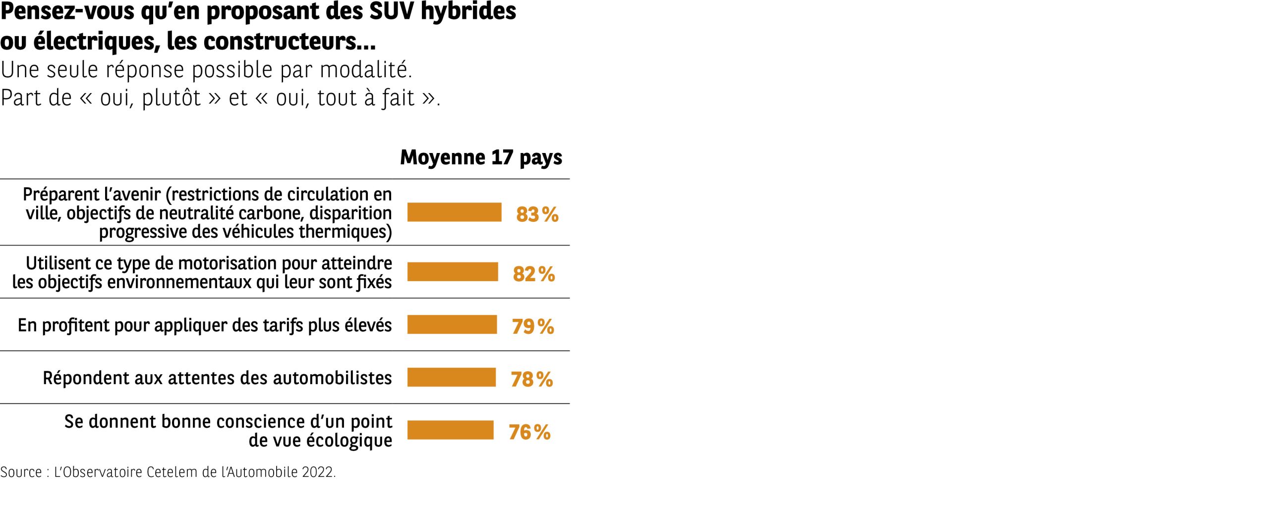 L’infographie présente, en moyenne pour 17 pays, la part de répondants estimant que les constructeurs poursuivent diverses motivations en proposant des SUV hybrides ou électriques. Les réponses regroupent « oui, plutôt » et « oui, tout à fait ».
