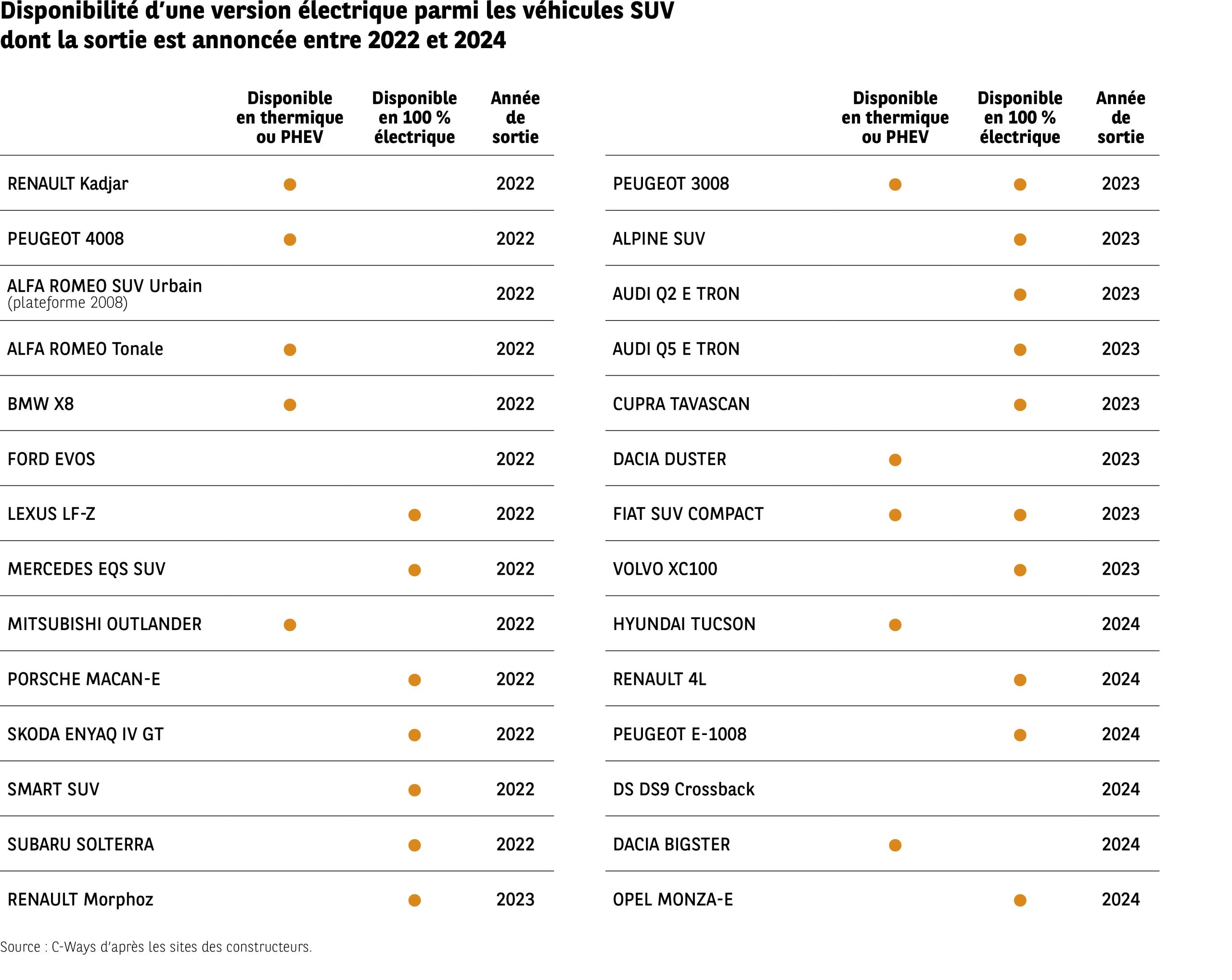 Le tableau liste des modèles de SUV dont la sortie est prévue entre 2022 et 2024. Pour chaque modèle, l’infographie indique s’il est disponible en version thermique/PHEV, en version 100 % électrique, ainsi que son année de sortie.