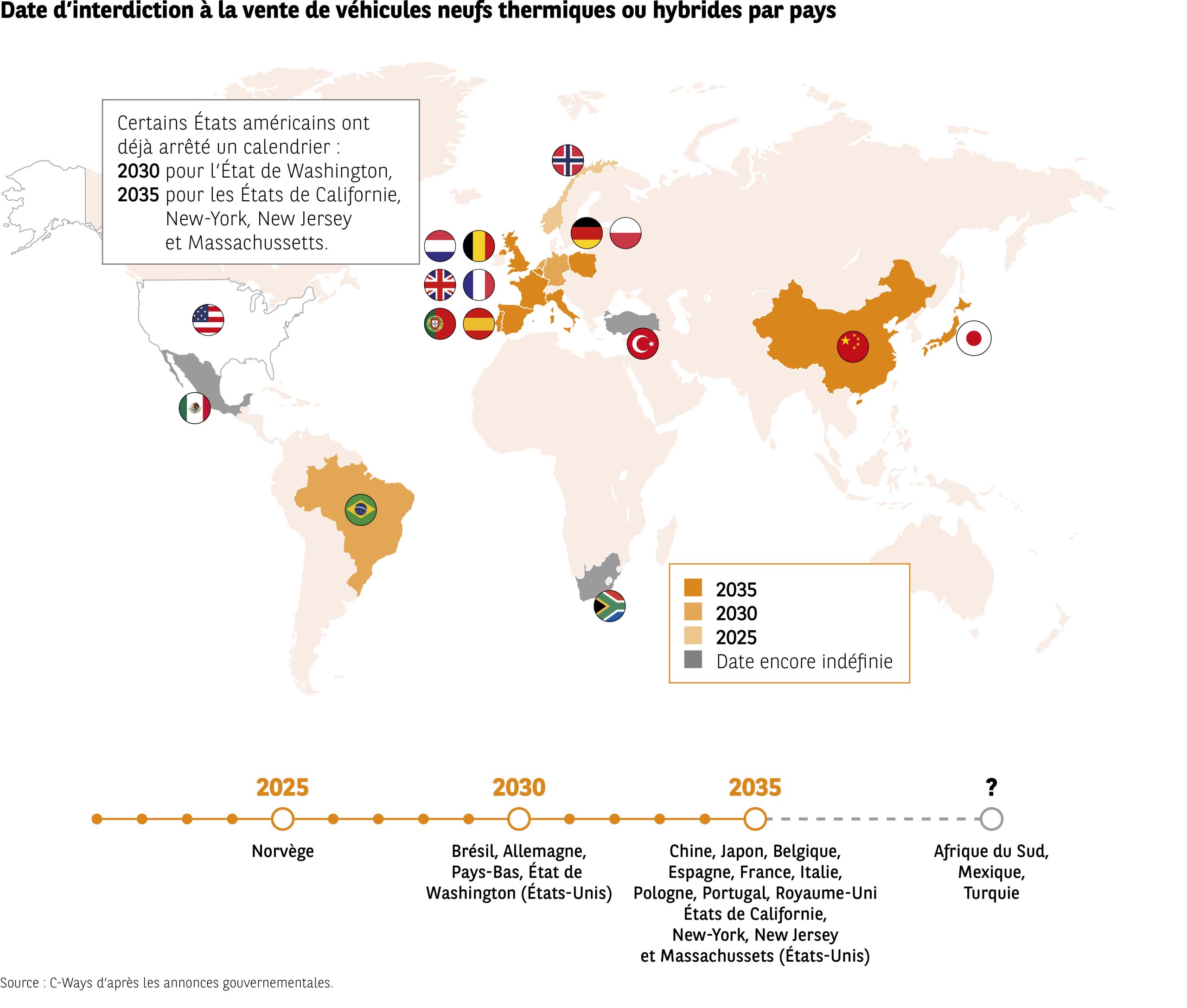 La carte représente les dates annoncées par divers pays concernant l’interdiction de la vente de véhicules neufs thermiques ou hybrides. Les pays sont associés à trois échéances : 2025, 2030 ou 2035.