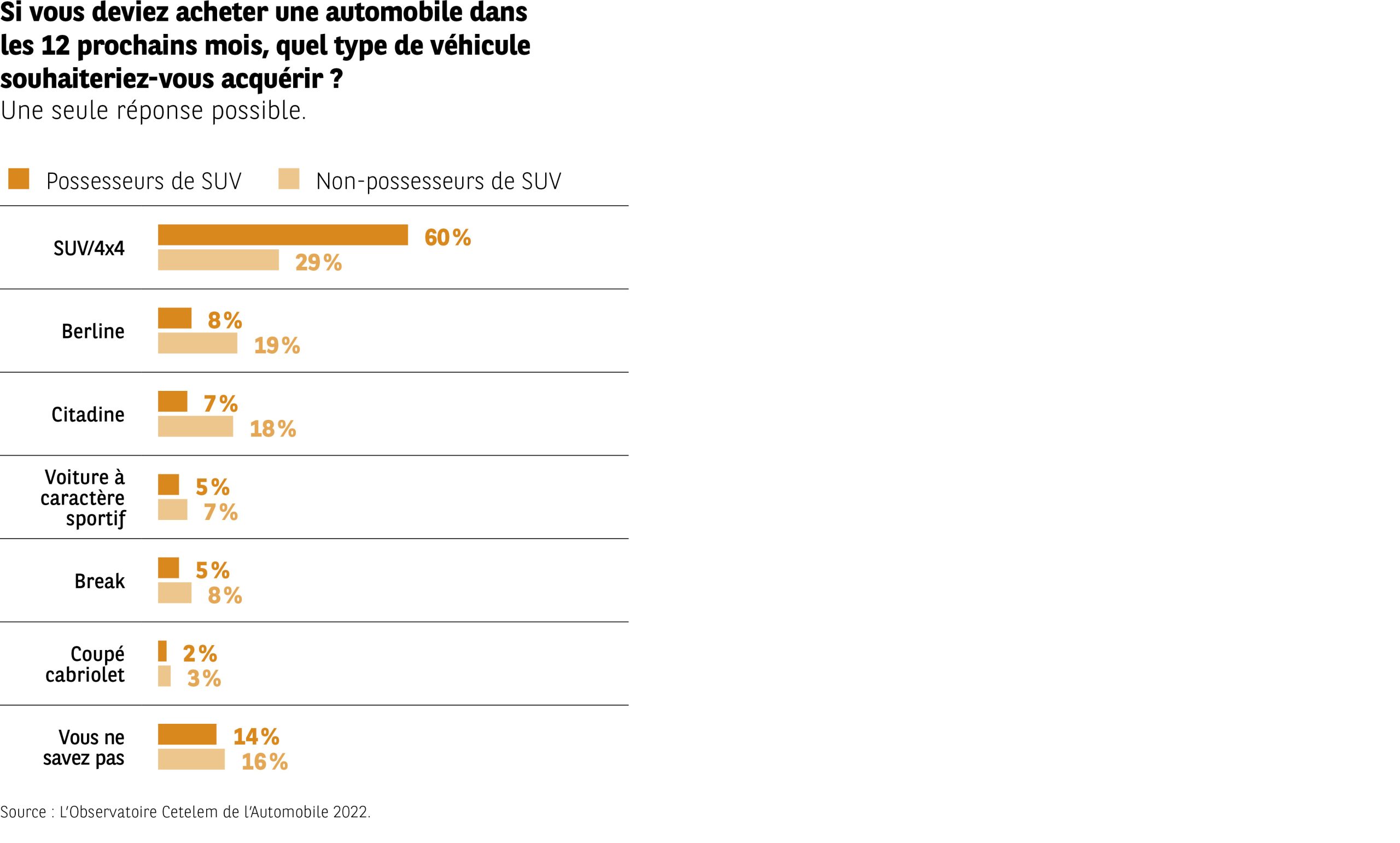 L’infographie compare, pour plusieurs catégories de véhicules, la part de répondants déclarant vouloir acquérir ce type dans les 12 prochains mois. Deux groupes sont présentés : possesseurs de SUV et non-possesseurs.