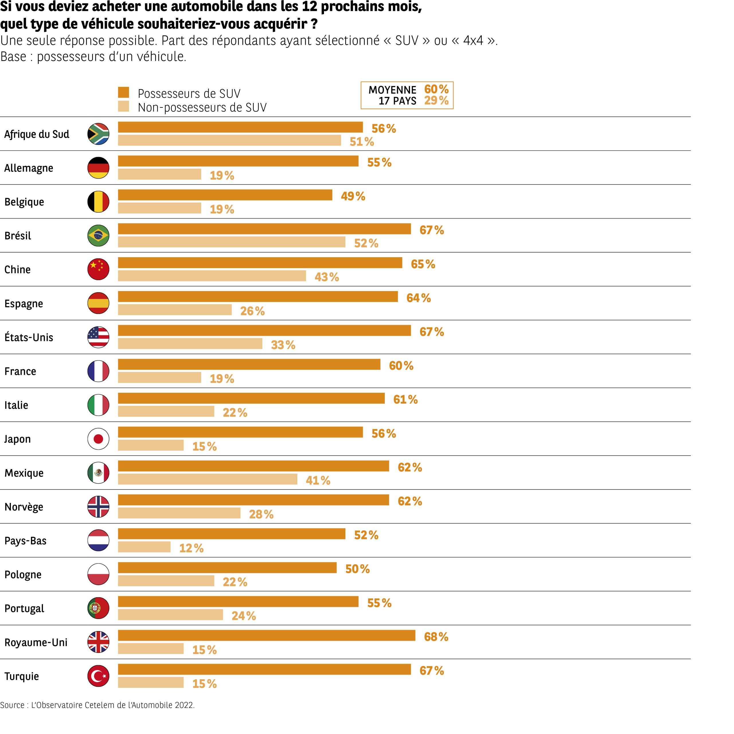 Le visuel compare, dans 17 pays, la part de personnes déclarant vouloir acheter un SUV ou un 4×4 dans les 12 prochains mois. Deux groupes sont présentés : possesseurs de SUV et non-possesseurs.