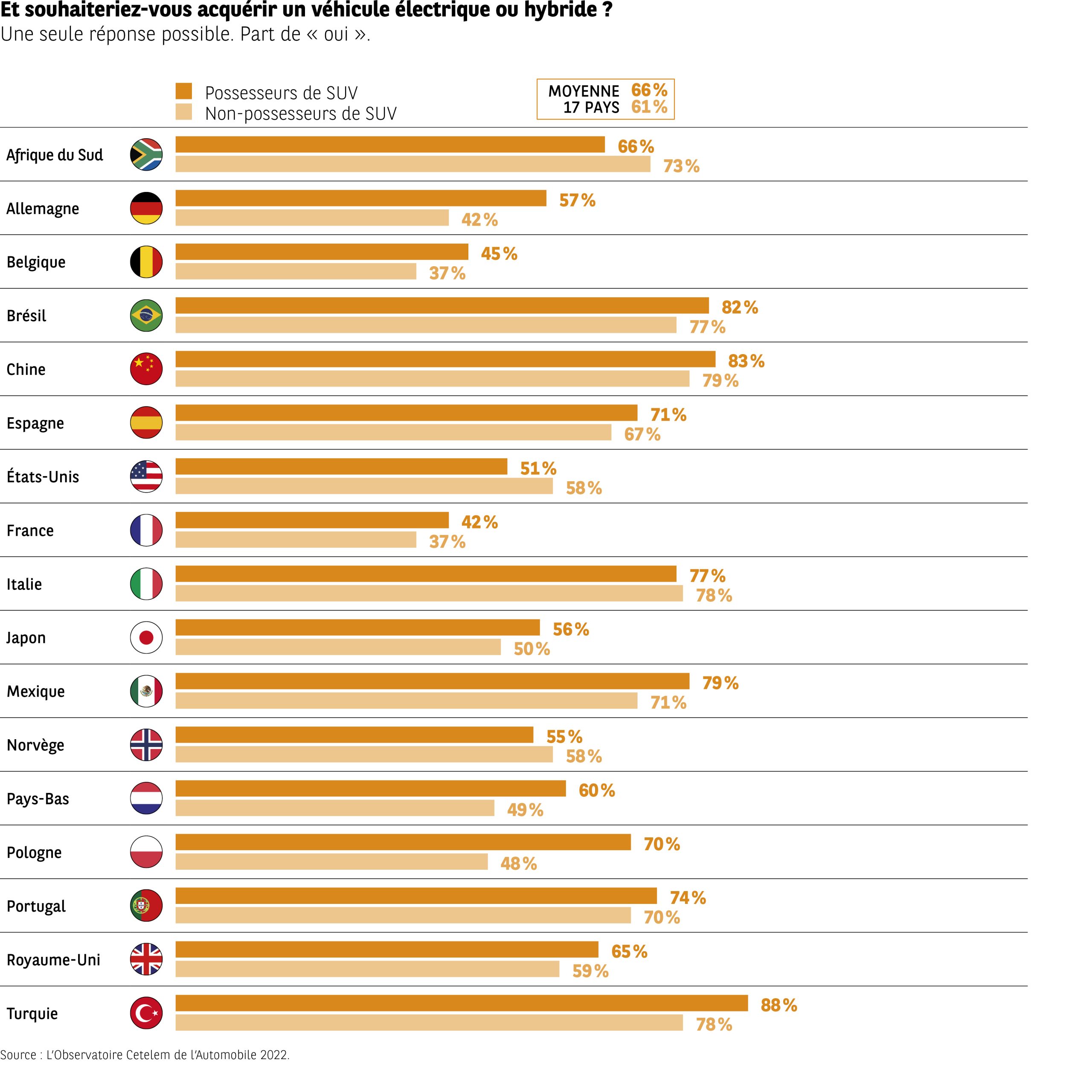 l’infographie présente, pour 17 pays, la proportion de répondants déclarant vouloir acquérir un véhicule électrique ou hybride. Deux groupes sont distingués : possesseurs de SUV et non-possesseurs.