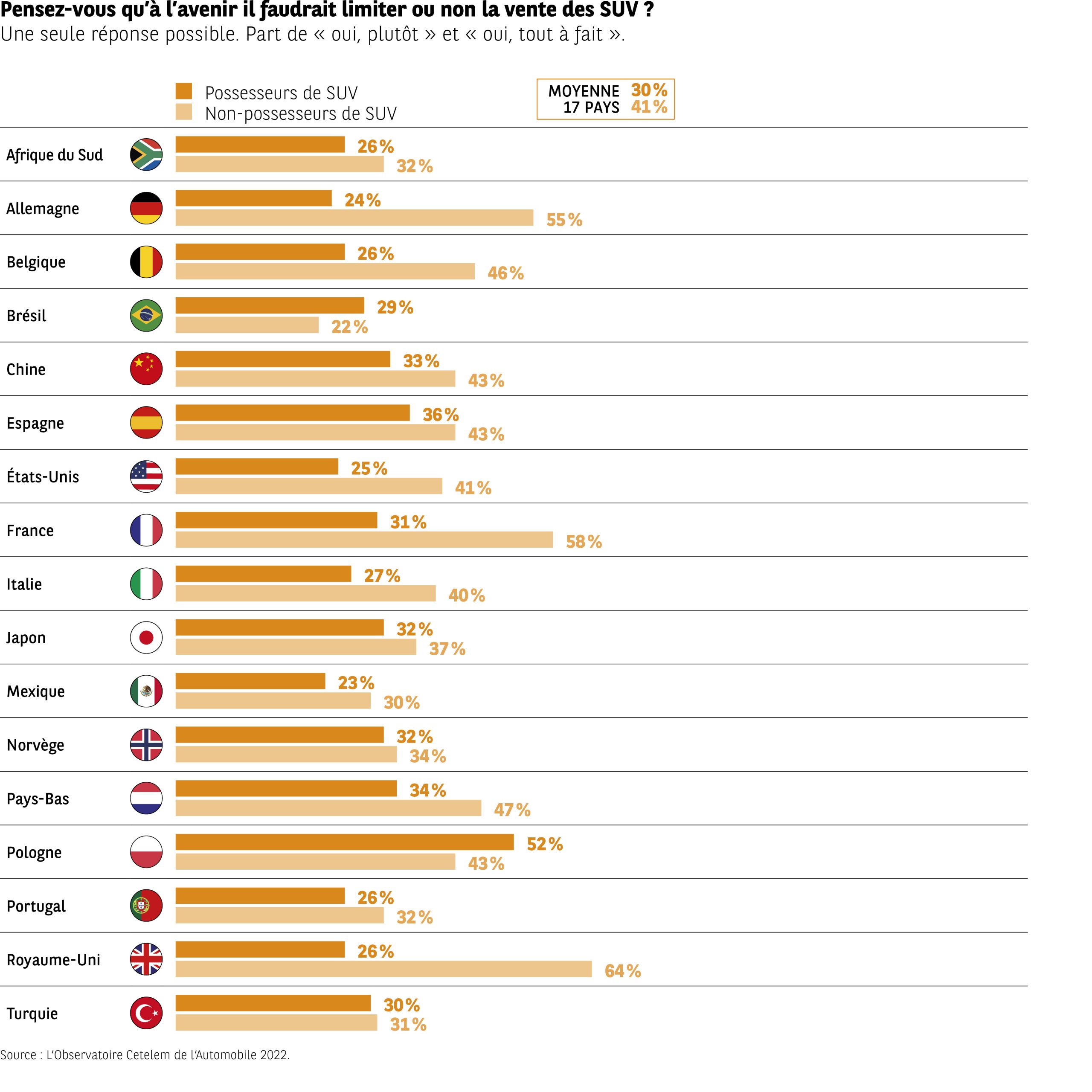 l’infographie compare, dans 17 pays, la part de répondants estimant qu’il faudrait limiter ou fortement limiter la vente de SUV à l’avenir.