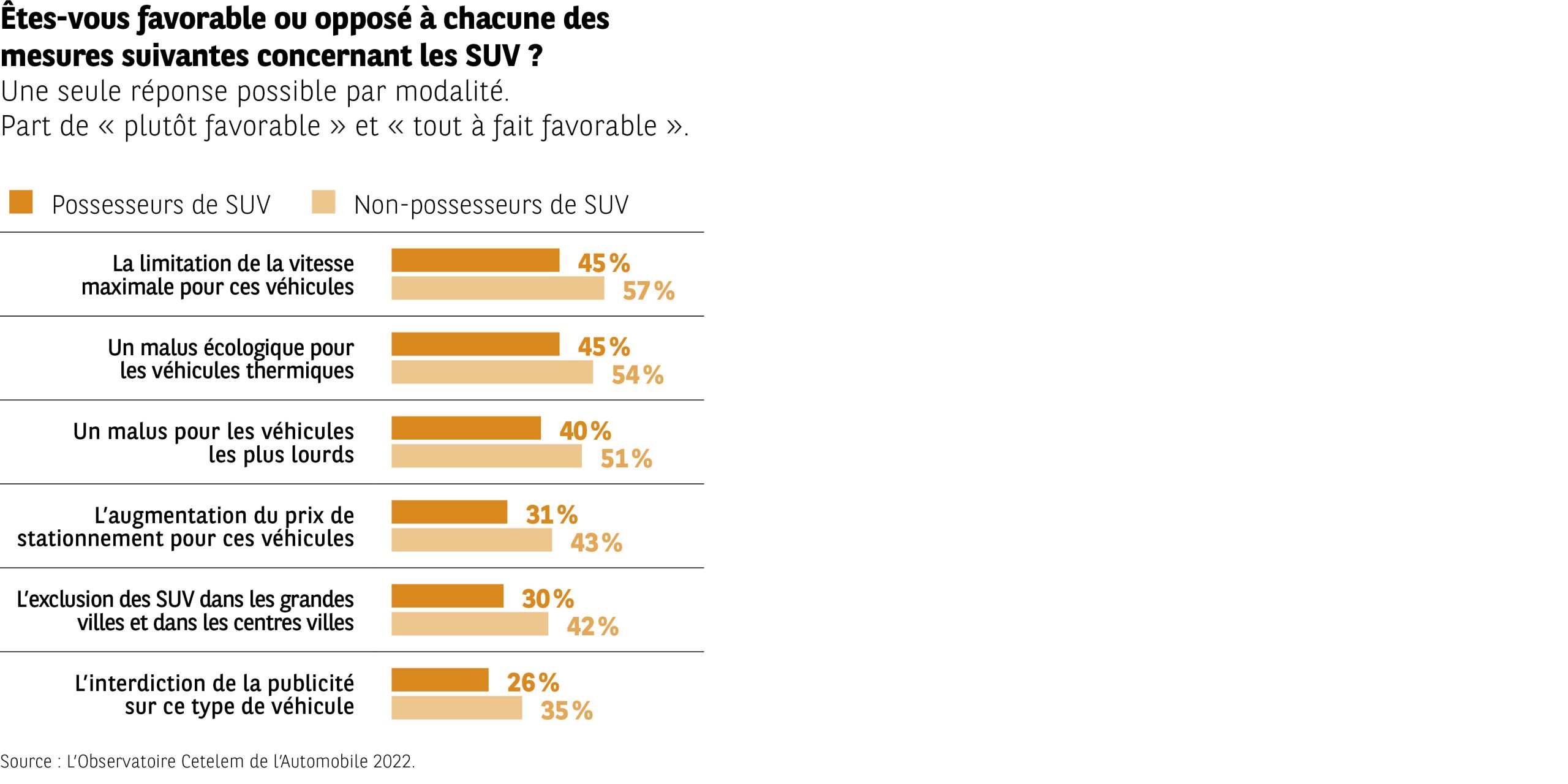L’infographie indique la part de répondants se déclarant « plutôt favorable » ou « très favorable » à diverses mesures concernant les SUV.