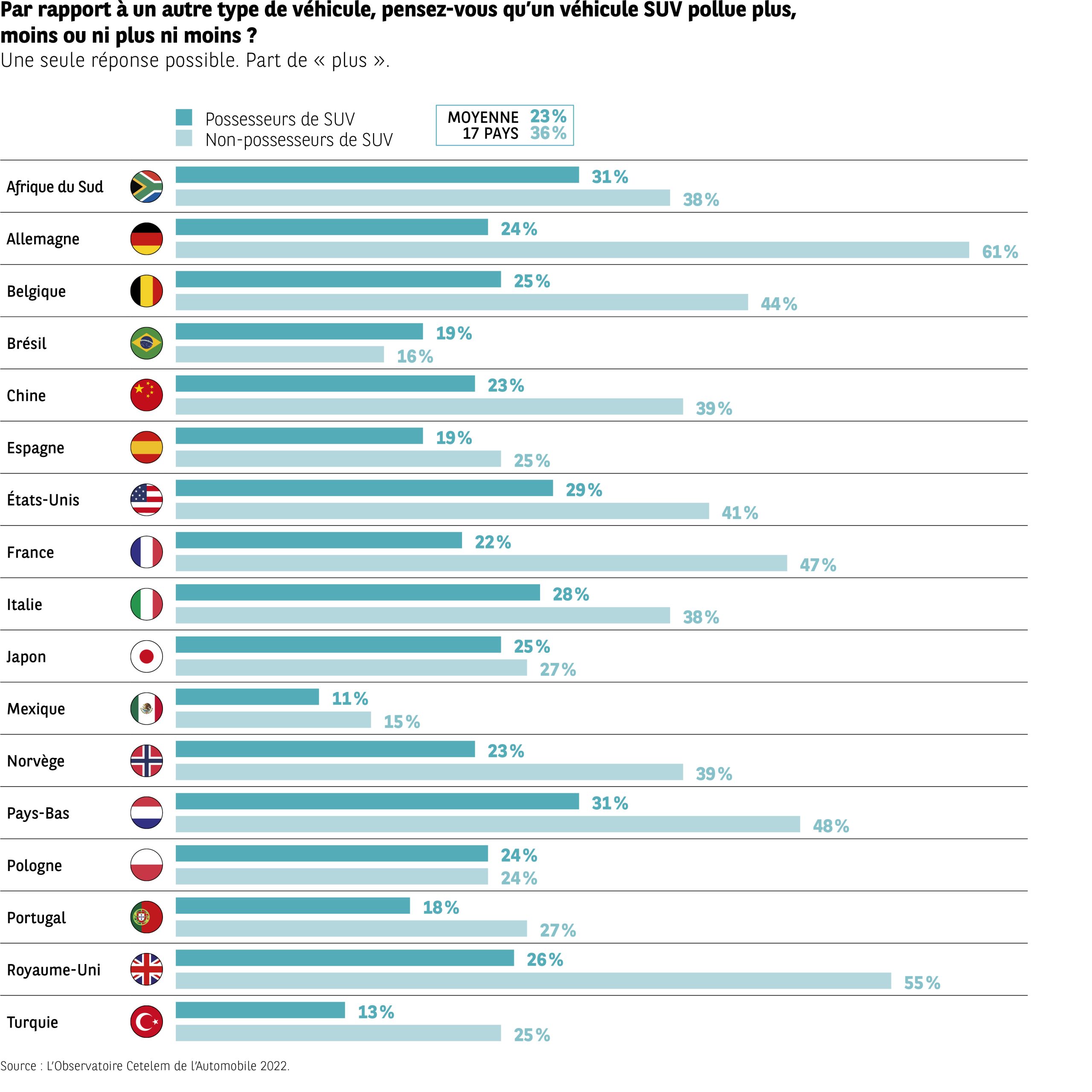 Les possesseurs de SUV néerlandais et sud‑africains sont ainsi les plus critiques (31 %) à l’inverse des Mexicains et des Turcs (11 % et 13 %).