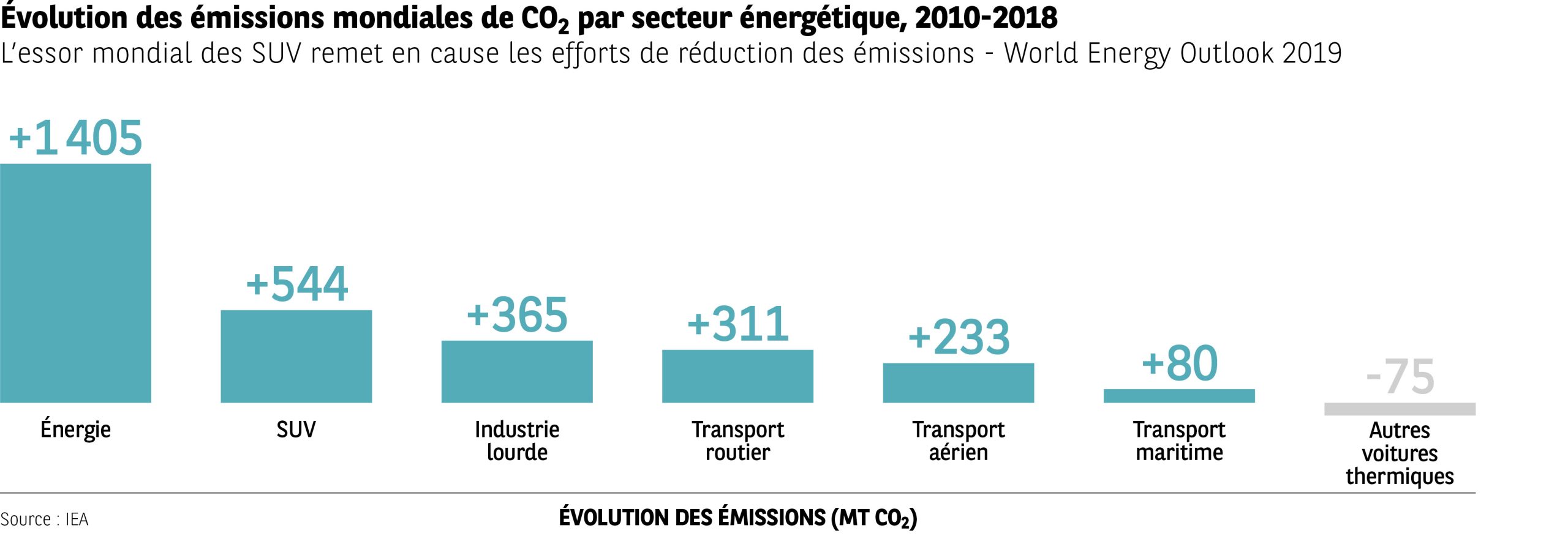 Avec constance et régularité, le débat public se fait écho des critiques quis’abattent sur le SUV en la matière. Selon une étude d’octobre 2019 de l’Agence internationale de l’énergie, les SUV sont les deuxièmes contributeurs de l’augmentation des émissions de CO2 au niveau mondial depuis 2010, derrière la production d’électricité, précédant l’industrie lourde, le transport routier et l’aviation. Une étude du Fonds mondial pour la nature (WWF) arrive aux mêmes conclusions.