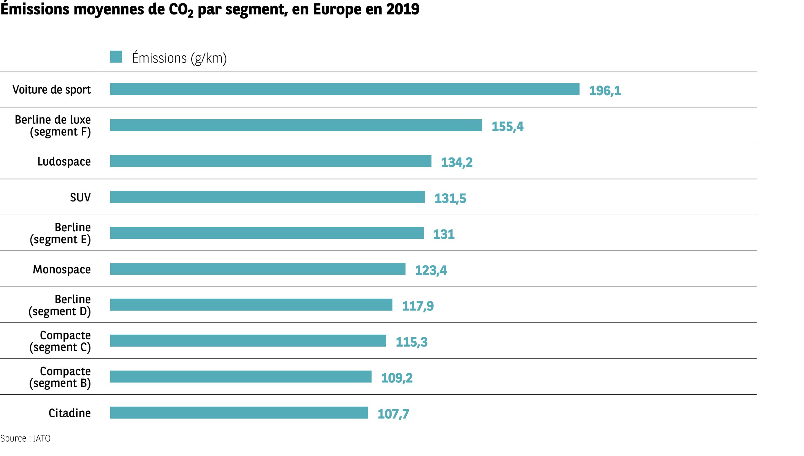 L’infographie présente les émissions moyennes de CO₂ en grammes par kilomètre pour différents segments de véhicules en Europe en 2019.