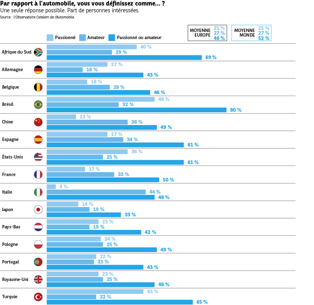Si 1 personne sur 2 se dit intéressée par l’automobile, cet intérêt est plus volontiers placé sous le signe de la raison que de la passion. Un quart seulement des personnes interrogées se déclarent réellement passionnées par cet univers (Fig. 14). On les rencontre essentiellement en Turquie, en Afrique du Sud et au Brésil (43 %, 40 % et 48 %), territoires de conquête automobile récents, ainsi qu’aux États‑Unis où la voiture est reine (36 %). A contrario, en Chine et en Italie, la passion n’est pas de mise. Avec seulement 4 % de passionnés, les Italiens font mentir le cliché qui les identifie à des accrocs aux belles mécaniques. Soulignons aussi que de façon globale la passion a un prix ou plutôt correspond à des revenus élevés. Les ménages les plus aisés sont presque deux fois plus nombreux à se déclarer passionnés que ceux aux revenus les plus bas (32 % vs 19 %).