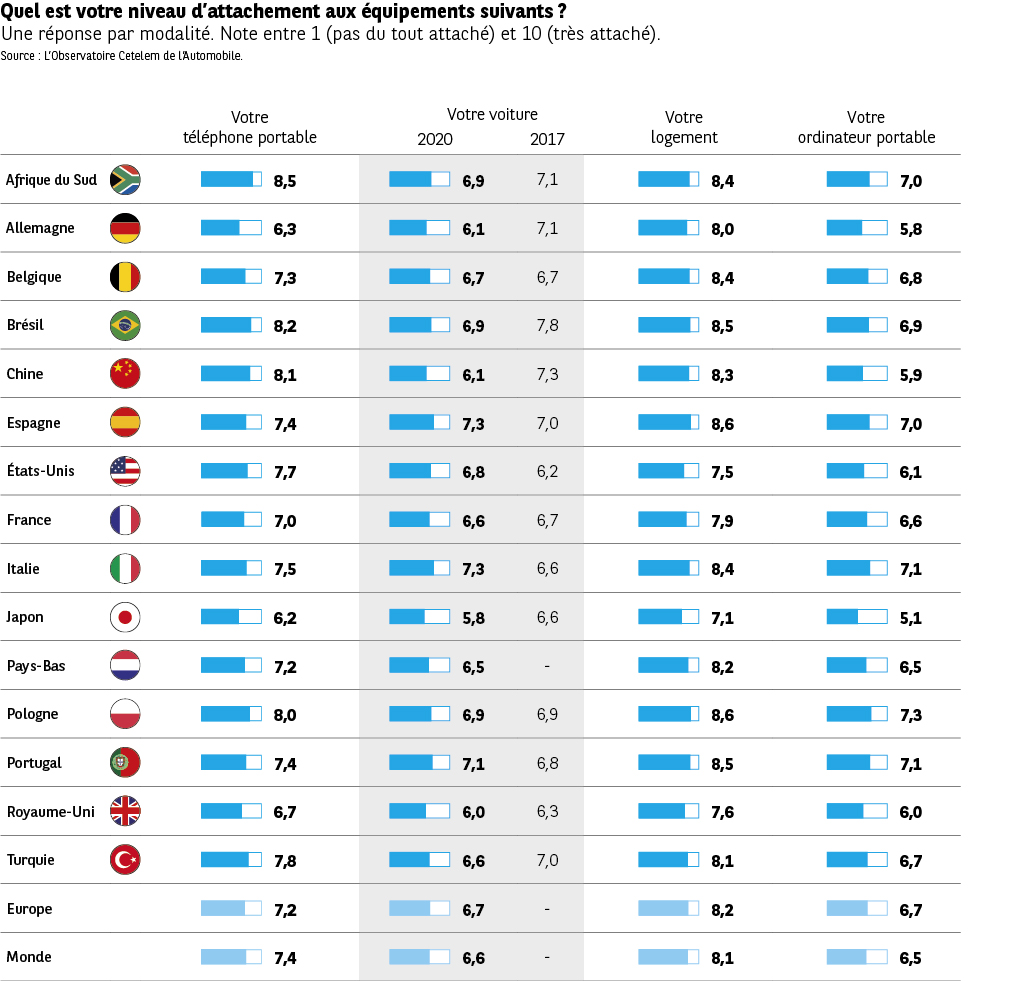 Si la voiture fait moins rêver, on n’y demeure pas moins relativement attaché. Un attachement qui au fil du temps reste constant. Dans l’Observatoire Cetelem 2017 « Ma voiture bien‑aimée », le score obtenu en moyenne par l’automobile en matière d’attachement s’élevait à 6,7. Quatre ans plus tard, il est quasiment identique : 6,6 à l’échelle mondiale, 6,7 en Europe, avec des pays latins qui se déclarent les plus proches de leur véhicule (Fig. 15). En revanche, la voiture n’est plus la « préférée », comme c’était alors le cas. Elle est systématiquement devancée par le téléphone portable, produit incontournable, indispensable et indépassable du monde moderne (8,1 dans le Monde, 8,2 en Europe). Le critère des revenus fait apparaître une très nette disparité entre d’un côté les personnes aisées très attachées à leur voiture (7,4), et de l’autre des personnes aux revenus faibles qui le sont beaucoup moins (5,9). La valeur monétaire et d’usage du véhicule explique sans doute cette différence.