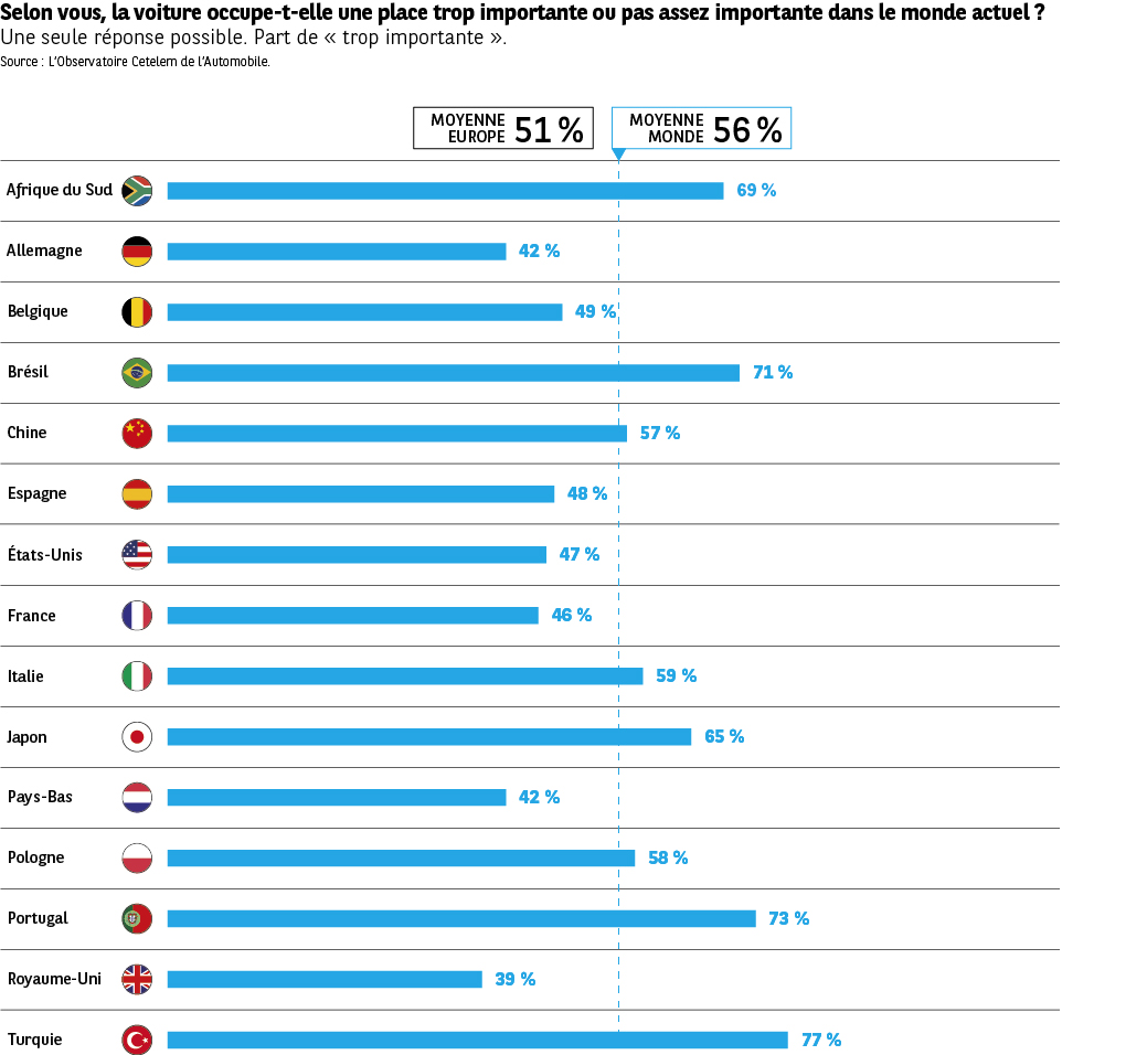 La voiture verrait‑elle donc son image s’écorner ? En tous cas, sa place est jugée relativement trop importante dans un monde économique, passé de l’industriel au numérique. Plus d’1 personne sur 2 l’estime avec sur ce sujet des disparités très marquées. Les pays émergents, où l’importance du marché automobile est récente, ainsi que le Portugal et le Japon, stigmatisent cette place, 8 Turcs sur 10 partageant notamment ce point de vue (Fig. 16). À l’inverse, les pays de culture automobile plus ancienne s’en accommodent plus volontiers (respectivement 39 %, 42 % et 46 % pour le Royaume‑Uni, l’Allemagne et la France). Avec 42 % d’opinions modérées, les Pays‑Bas, royaume du vélo, n’accablent pas non plus un véhicule qui joue les seconds rôles.