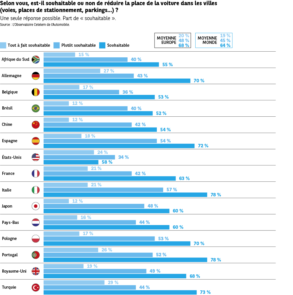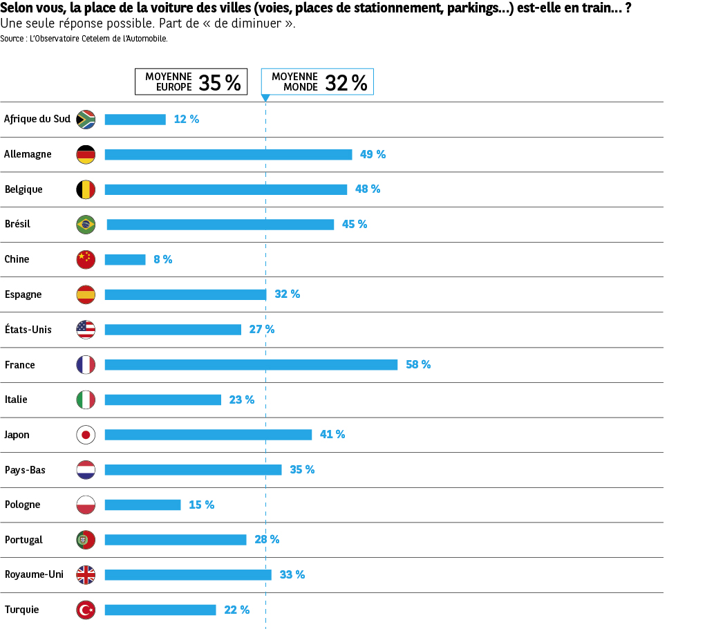 Si la place de la voiture est trop importante, elle s’estompe timidement du paysage aux yeux des personnes interrogées. Un tiers estime notamment que sa présence s’efface au sein des villes pour laisser plus d’espace à travers la diminution des voies, des places de parking et de stationnement (Fig. 17). Sur cette question, on retrouve une fois encore les pays dont les représentants écologiques sont les plus nombreux, tant au plan national qu’au plan local. 6 Français sur 10, 1 Allemand et 1 Belge sur 2 constatent cet effacement urbain progressif. Inversement, seulement 1 Chinois sur 10 partage ce sentiment. La décongestion automobile urbaine dans les mégalopoles de l’Empire du Milieu ne semble pas être pour demain.
