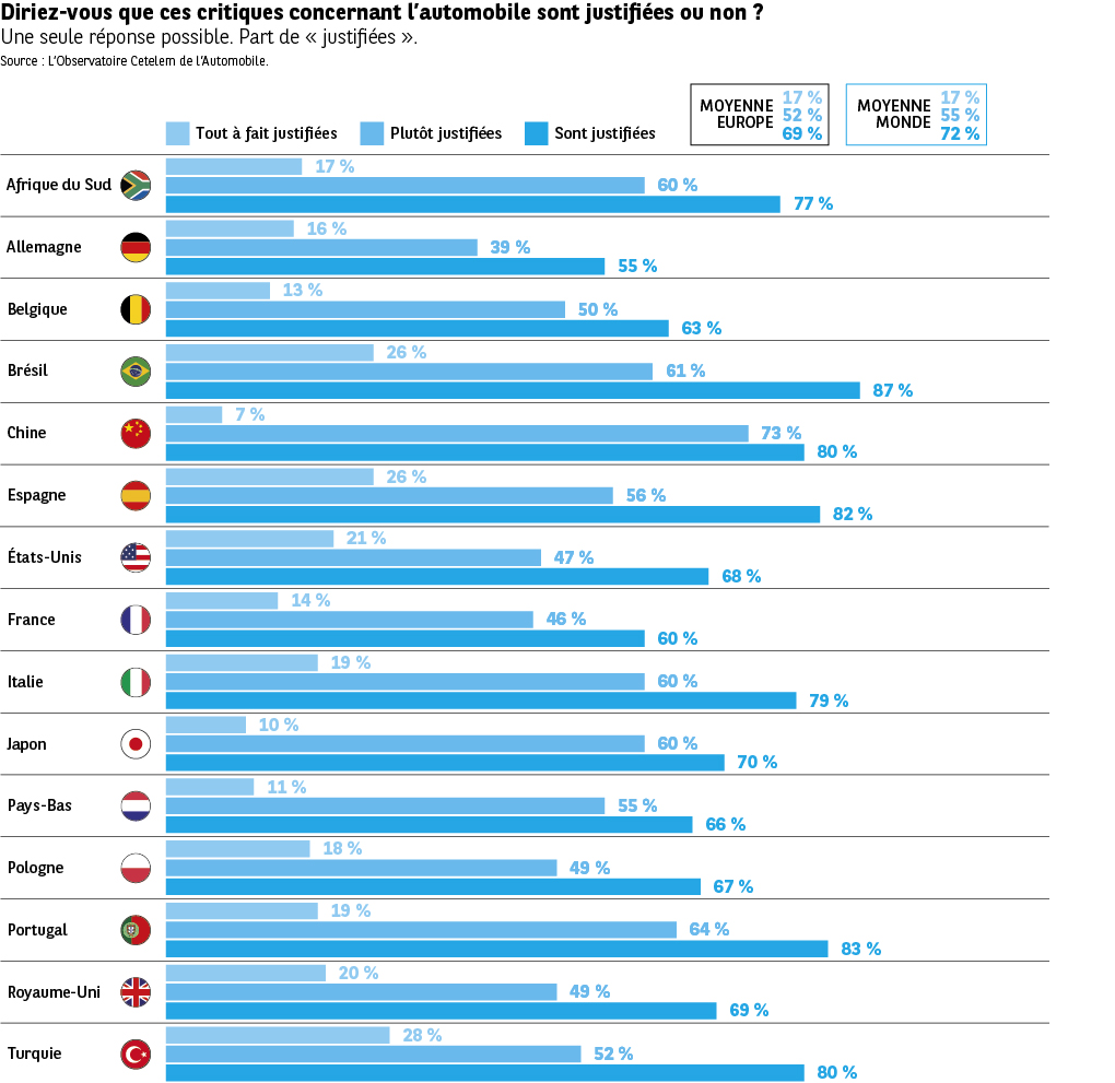Même les États‑Unis, qui ont développé ces dernières années un certain climato‑scepticisme politique, recensent 68 % d’opinions pour condamner l’influence environnementale néfaste de l’automobile.
