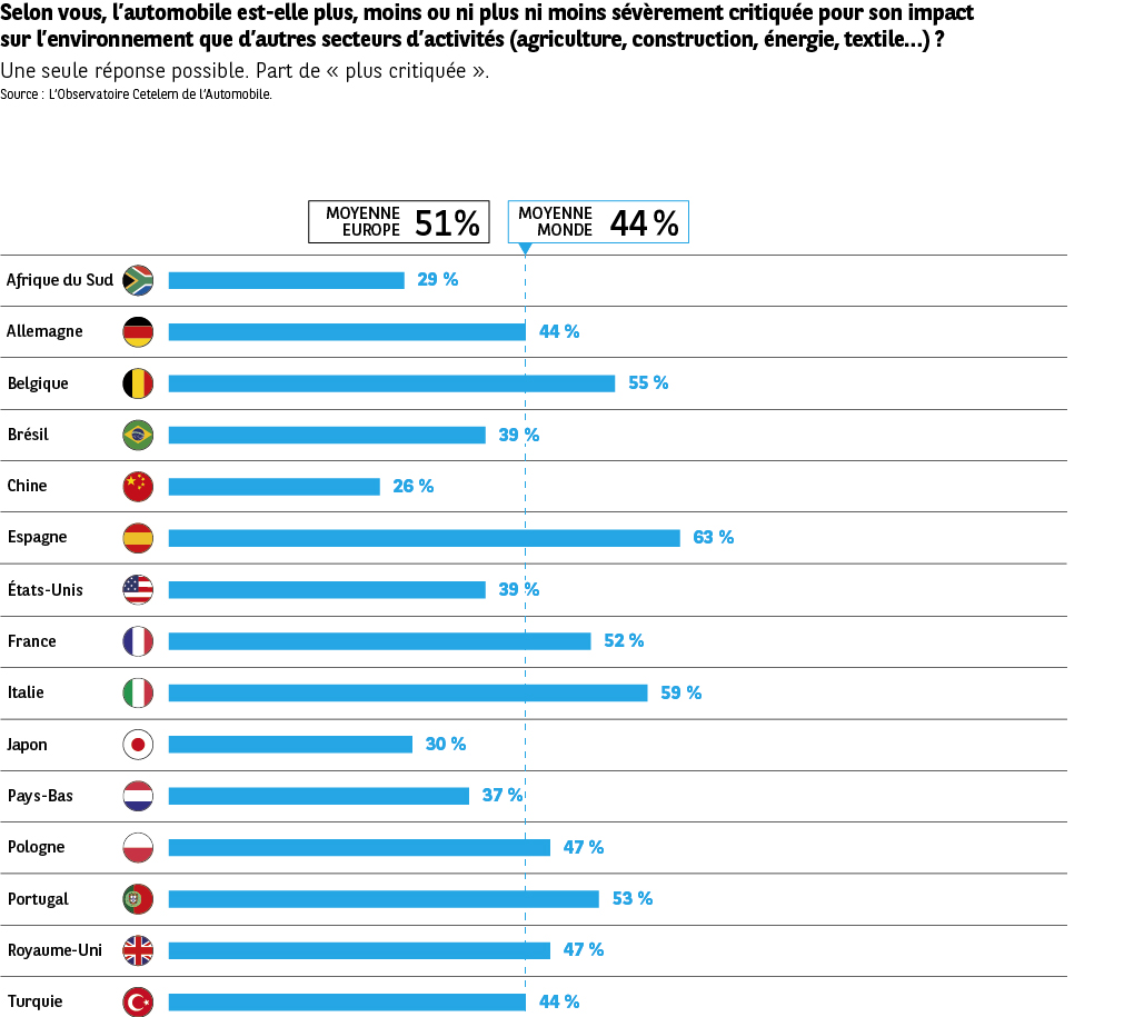 Cependant, 1 personne sur 2 en Europe (44 % à l’échelle mondiale) (Fig. 12) estime que l’automobile est plus sévèrement critiquée à ce sujet que d’autres secteurs tels la construction, l’agriculture ou encore les autres transports. Sans doute plus matures au plan environnemental et mieux informés à ce propos, les pays de l’Union européenne sont les plus nombreux à le penser (63 % en Espagne, 59 % en Italie). À l’opposé, en Chine où la voiture est davantage que l’industrie associée à la pollution urbaine, le sentiment d’une voiture injustement critiquée est très peu partagé (26 %).