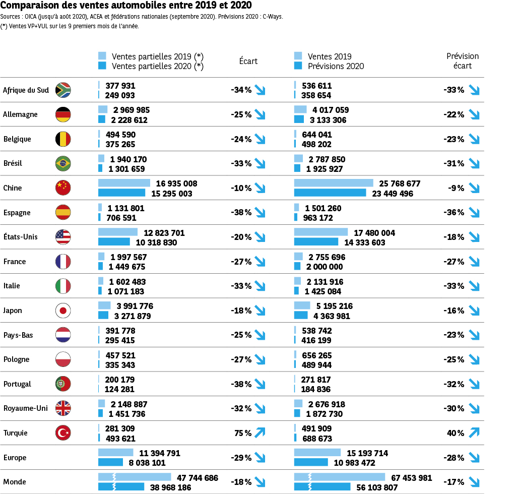 Deux pays échappent à ce marasme. La Chine, donc, avec un marché qui rebondit dès le mois d’avril pour connaître depuis lors une stabilisation progressive. Et la Turquie avec une hausse spectaculaire des ventes qui doit tout à l’effondrement en 2019 de la livre turque, lequel avait engendré un recul spectaculaire du marché. Sinon, de tous les pays de cet Observatoire, le Japon est celui qui s’en sort le « mieux », alors que l’Espagne et le Royaume‑Uni constatent les plus fortes baisses.