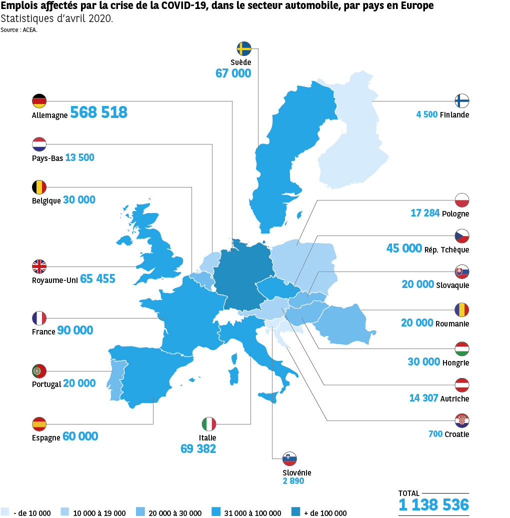 En avril 2020, l’Europe comptabilisait a minima 1,1 million d’emplois affectés dans le secteur automobile. Ces chiffres sont non exhaustifs et ne concernent que les personnes directement employées par les constructeurs d’automobiles, de camions, de fourgonnettes et de bus. L’impact sur la chaîne d’approvisionnement automobile au sens large est encore plus critique.