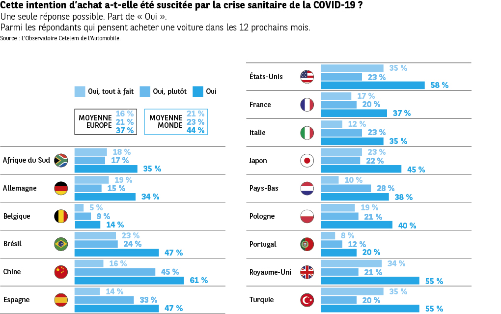 Productions et ventes en baisse pour 2020, et intentions d’achat pour les 12 mois à venir qui n’incitent pas à un optimisme soutenu. Précisons d’emblée que l’enquête a été réalisée en septembre, avant la seconde vague de la pandémie qui a touché tous les pays concernés. Pour autant, elle soulignait des intentions d’achat en nette baisse par rapport à 2019. Alors que 41 % des personnes interrogées envisageaient il y a un an l’achat d’un véhicule dans les 12 mois à venir, ils ne sont plus que 32 % à le faire (27 % des Européens) (Fig. 3). Les pays émergents, ainsi que la Chine, l’Italie et les États‑Unis, compensent cet effet de balancier négatif en se montrant les plus volontaristes. Pour autant, hormis en Chine qui, nous l’avons souligné, a connu en premier une certaine « reprise », ces intentions sont partout en net recul.