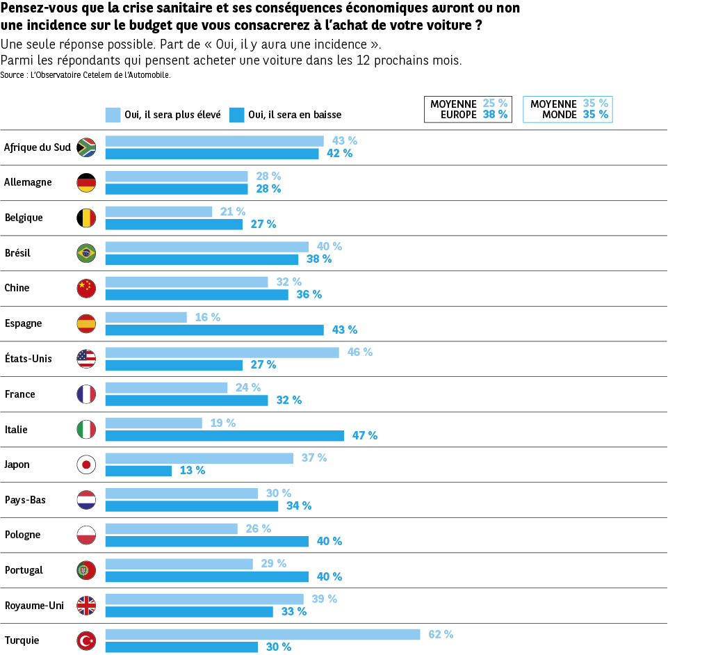 De même, l’impact budgétaire du virus sur l’achat du futur véhicule fait apparaître deux groupes de pays opposés, alors qu’au plan global on recense autant d’automobilistes à vouloir dépenser plus qu’à dépenser moins (35 % dans les deux cas) (Fig. 6). Les plus dépensiers regroupent pour l’essentiel les pays émergents, mais aussi les États‑Unis, le Royaume‑Uni et le Japon. Les Turcs affichent à ce sujet des intentions de budget en hausse très prononcées (62 %), dans la continuité des achats massifs de 2019. À l’inverse, le budget automobile futur s’inscrira à la baisse principalement dans les pays latins, avec notamment près d’1 Italien sur 2 à se projeter en ce sens.